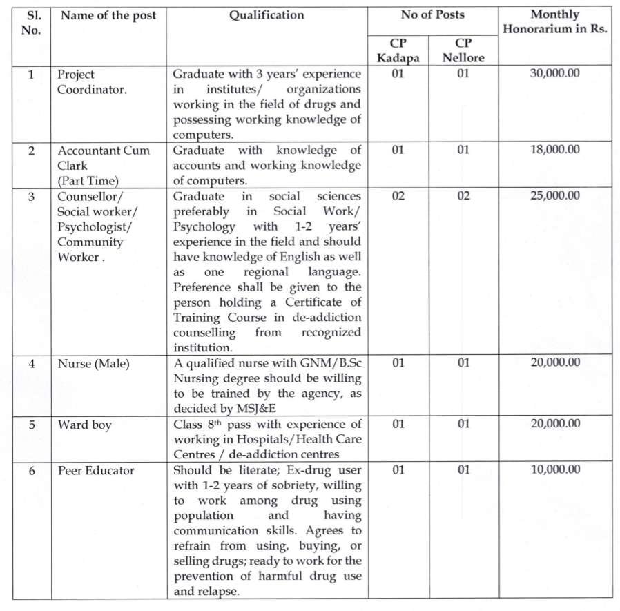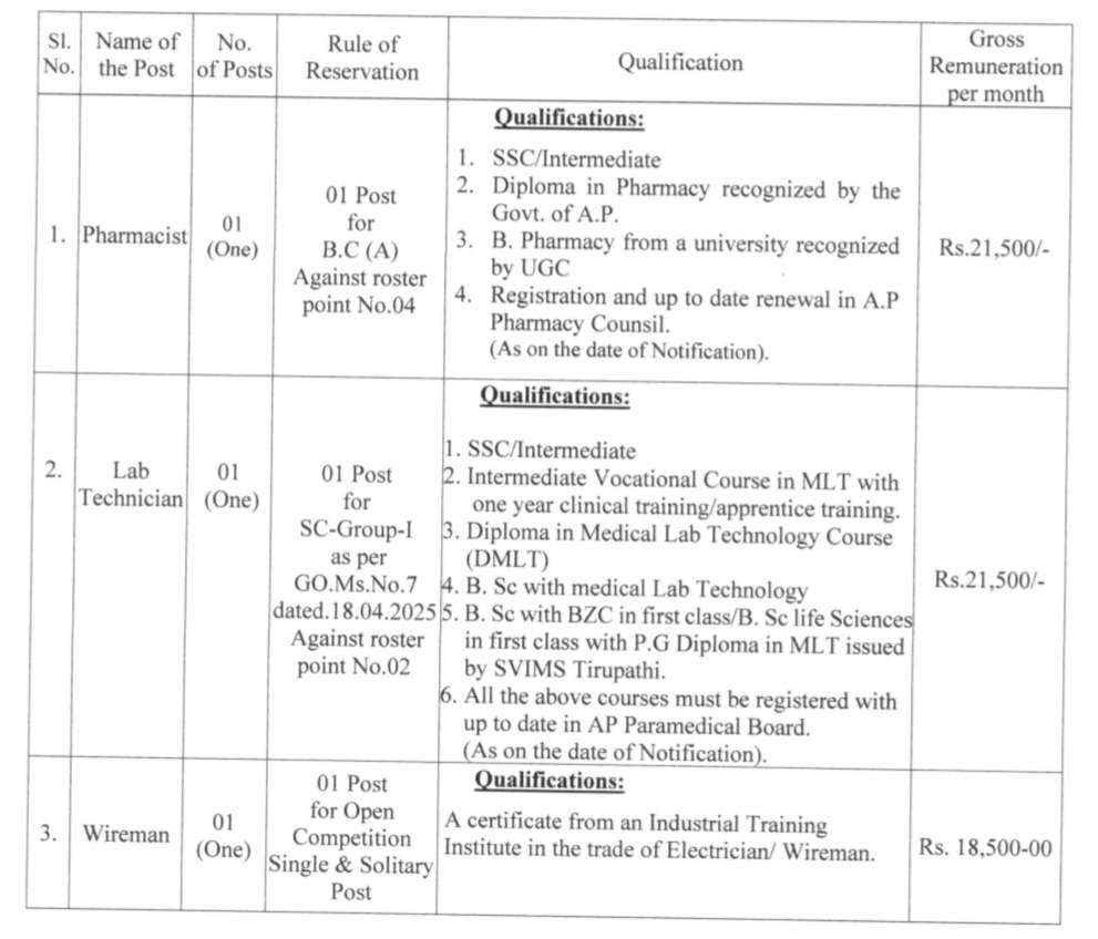 • ఫార్మసిస్ట్ : SSC/ఇంటర్మీడియట్ ఆంధ్రప్రదేశ్ ప్రభుత్వం గుర్తింపు పొందిన ఫార్మసీలో డిప్లొమా. UGC గుర్తింపు పొందిన విశ్వవిద్యాలయం నుండి బి. ఫార్మసీ. A.P ఫార్మసీ కౌన్సిల్లో రిజిస్ట్రేషన్ మరియు తాజా పునరుద్ధరణ. నెల జీతం రూ. 21,500/- ఇస్తారు.