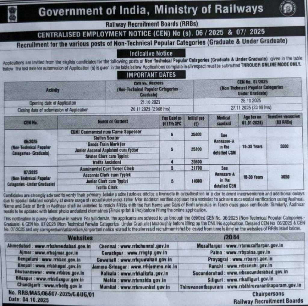 రైల్వే రిక్రూట్మెంట్ బోర్డులు (RRB) లో చీఫ్ కమర్షియల్ కమ్ టికెట్ సూపర్వైజర్, స్టేషన్ మాస్టర్, గూడ్స్ రైలు మేనేజర్, జూనియర్ అకౌంట్ అసిస్టెంట్ కమ్ టైపిస్ట్, సీనియర్ క్లర్క్ కమ్ టైపిస్ట్ & ట్రాఫిక్ అసిస్టెంట్ పోస్టులు కేటగిరీస్ గ్రాడ్యుయేట్ మరియు కమర్షియల్ కమ్ టికెట్ క్లర్క్, అకౌంట్స్ క్లర్క్ కమ్ టైపిస్ట్, జూనియర్ క్లర్క్ కమ్ టైపిస్ట్ & రైళ్లు క్లర్క్ కేవలం ఇంటర్మీడియట్ అర్హతతో పై పోస్టులకు అప్లై చేసుకోవచ్చు. వెబ్సైట్ https://www.rrbapply.gov.in/ ద్వారా ఆన్లైన్లో దరఖాస్తు చేసుకోవాలి. ఈ నోటిఫికేషన్ లో ఇంటర్ & Any డిగ్రీ చేసిన అభ్యర్థులందరూ కూడా అప్లై చేసుకోవచ్చు. 01.01.2026 నాటికి వయసు 18-33 సంవత్సరాలు మధ్యలో ఉండాలి. కంప్యూటర్ బేసిడ్ ఎగ్జామ్ మరియు ఇంటర్వ్యూ ద్వారా సెలక్షన్ ఉంటుంది. Any డిగ్రీ అర్హతతో దరఖాస్తు అప్లికేషన్ ప్రారంభం 21.10.2025 నుండి 20.11.2025 (రాత్రి 3:59 గంటలు) వరకు తెరిచి ఉంటుంది. ఇంటర్మీడియట్ అర్హతతో దరఖాస్తు అప్లికేషన్ ప్రారంభం 28.10.2025 నుండి 27.11.2025 (రాత్రి 3:59 గంటలు) వరకు తెరిచి ఉంటుంది.
