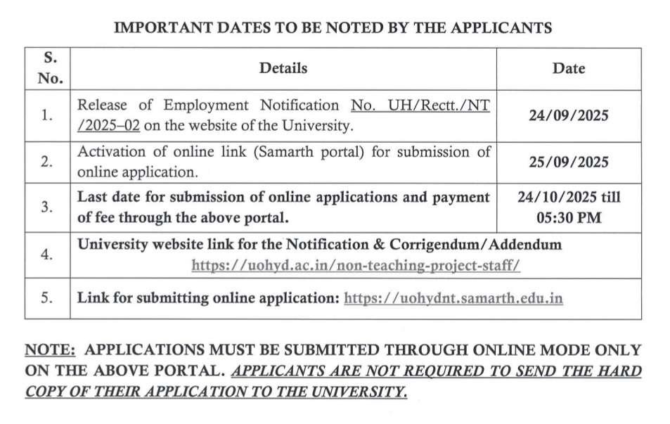 ఎలా దరఖాస్తు చేయాలి : విశ్వవిద్యాలయ వెబ్సైట్లో (https://uohyd.ac.in/non-teaching-project-staff/) మాత్రమే ప్రచురించబడే ఈ నోటిఫికేషన్కు ఏవైనా సవరణలు లేదా సవరణలు జారీ చేసే హక్కు విశ్వవిద్యాలయానికి ఉంది. దరఖాస్తుదారులందరూ ఎప్పటికప్పుడు విశ్వవిద్యాలయ వెబ్సైట్ను సందర్శించాలని సూచించారు.