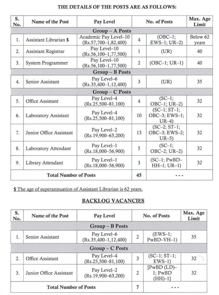 »పోస్టుల వివరాలు: అసిస్టెంట్ లైబ్రేరియన్, అసిస్టెంట్ రిజిస్ట్రార్, సిస్టమ్ ప్రోగ్రామర్, సీనియర్ అసిస్టెంట్, ఆఫీస్ అసిస్టెంట్, ప్రయోగశాల సహాయకుడు, జూనియర్ ఆఫీస్ అసిస్టెంట్, ప్రయోగశాల అటెండెంట్ & లైబ్రరీ అటెండెంట్ ఉద్యోగుల భర్తీ చేస్తున్నారు. మొత్తం పోస్టు 52 ఉన్నాయి.