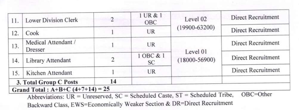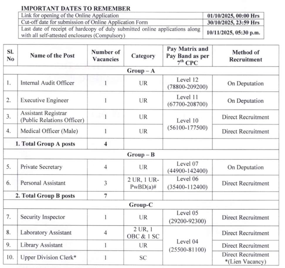 పోస్ట్ పేరు :: ఎగ్జిక్యూటివ్ ఇంజనీర్, అసిస్టెంట్ రిజిస్ట్రార్ (పబ్లిక్ రిలేషన్స్ ఆఫీసర్), మెడికల్ ఆఫీసర్, ప్రైవేట్ సెక్రటరీ, వ్యక్తిగత సహాయకుడు, సెక్యూరిటీ ఇన్స్పెక్టర్, ప్రయోగశాల సహాయకుడు, లైబ్రరీ అసిస్టెంట్, అప్పర్ డివిజన్ క్లర్క్, లోయర్ డివిజన్ క్లర్క్, మెడికల్ అటెండెంట్/డ్రెస్సర్, లైబ్రరీ అటెండెంట్ & కిచెన్ అటెండెంట్ పోస్టులు భర్తీ.