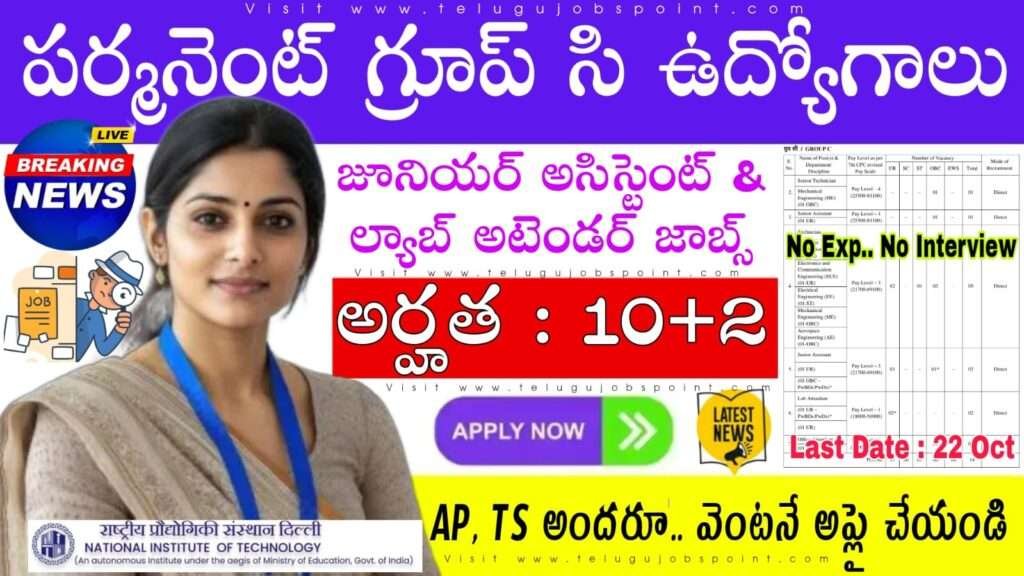 NIT Delhi Non Teaching Notification 2025 Latest NIT Jobs in Telugu : భారత ప్రభుత్వం, నేషనల్ ఇన్స్టిట్యూట్ ఆఫ్ టెక్నాలజీ (NIT)లో టెక్నికల్ అసిస్టెంట్, సీనియర్ టెక్నీషియన్, సీనియర్ అసిస్టెంట్, జూనియర్ అసిస్టెంట్, అటెండెంట్ & ఆఫీస్ అటెండెంట్ ఉద్యోగుల కోసం నోటిఫికేషన్ విడుదల చేశారు. అప్లికేషన్ చివరి తేదీ 22-10-2025.