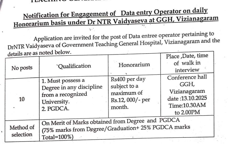 జిజిహెచ్, విజయనగరం తేదీ: 13.10.2025 సమయం: ఉదయం 10.30 మధ్యాహ్నం 2.00 గంటల వరకు విజయనగరంలోని ప్రభుత్వ బోధనా జనరల్ హాస్పిటల్లోని డాక్టర్ ఎన్టీఆర్ వైద్యసేవకు సంబంధించిన డేటా ఎంట్రీ ఆపరేటర్ పోస్టుకు దరఖాస్తులు ఆహ్వానించబడ్డాయి.