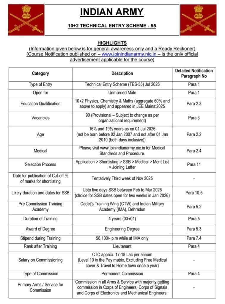 ఇండియన్ ఆర్మీలో చిన్న ఏజ్ లోనే పెర్మనెంట్ ఆఫీసర్ స్థాయిలో ఉద్యోగాలు విడుదల కావడం జరిగింది. ఫిజిక్స్, కెమిస్ట్రీ మరియు మ్యాథమెటిక్స్ (ఇకపై PCM గా సూచిస్తారు) సబ్జెక్టులతో 10+2 పరీక్షలో ఉత్తీర్ణత సాధించిన మరియు JEE (మెయిన్స్) 2025 పరీక్షకు హాజరైన మరియు తదుపరి పేరాల్లో సూచించిన అర్హత షరతులను పూర్తి చేసిన అవివాహిత పురుష అభ్యర్థుల నుండి దరఖాస్తులు ఆహ్వానించబడ్డాయి. టెక్నికల్ ఎంట్రీ స్కీమ్ (TES-55) కోసం ఆర్మీలో పర్మనెంట్ కమిషన్ మంజూరు కోసం దరఖాస్తులు ఆహ్వానించబడ్డాయి.