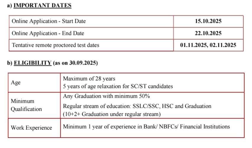 గుర్తింపు పొందిన బోర్డు/తత్సమానం నుండి కనీసం 50% మార్కులతో ఏదైనా గ్రాడ్యుయేషన్.. రెగ్యులర్ విద్యా విధానం. SSLC/SSC, HSC మరియు గ్రాడ్యుయేషన్ (రెగ్యులర్ స్ట్రీమ్ కింద 10+2+ గ్రాడ్యుయేషన్) పని అనుభవం : బ్యాంక్/NBFCలు/ఫైనాన్షియల్ ఇన్స్టిట్యూషన్లలో కనీసం 1 సంవత్సరం అనుభవం.