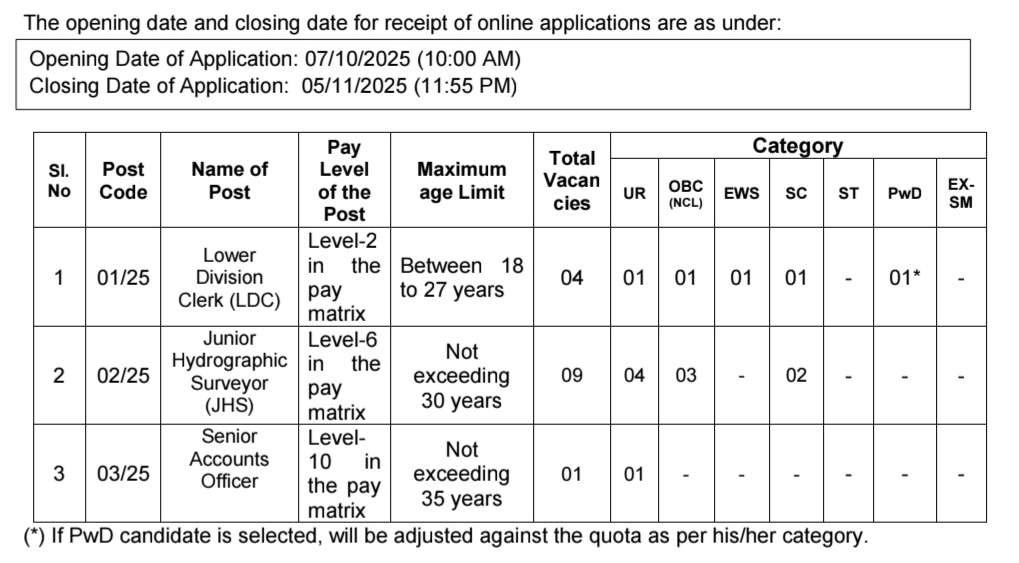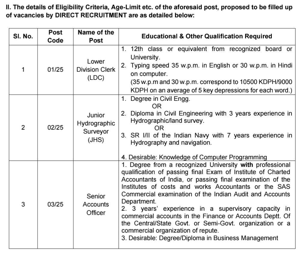 విద్యా అర్హత : గుర్తింపు పొందిన బోర్డు లేదా విశ్వవిద్యాలయం నుండి 12వ తరగతి లేదా సివిల్ ఇంజనీరింగ్లో డిగ్రీ లేదా సివిల్ ఇంజనీరింగ్లో డిప్లొమా మరియు హైడ్రోగ్రాఫిక్/ల్యాండ్ సర్వేలో 3 సంవత్సరాల అనుభవం లేదా డిగ్రీతో పాటు ఇన్స్టిట్యూట్ ఆఫ్ చార్టెడ్ అకౌంటెంట్స్ ఆఫ్ ఇండియా యొక్క ఫైనల్ పరీక్షలో ఉత్తీర్ణత సాధించి ఉండాలి. కంప్యూటర్ పరిజ్ఞానం కలిగి ఉండాలి.
