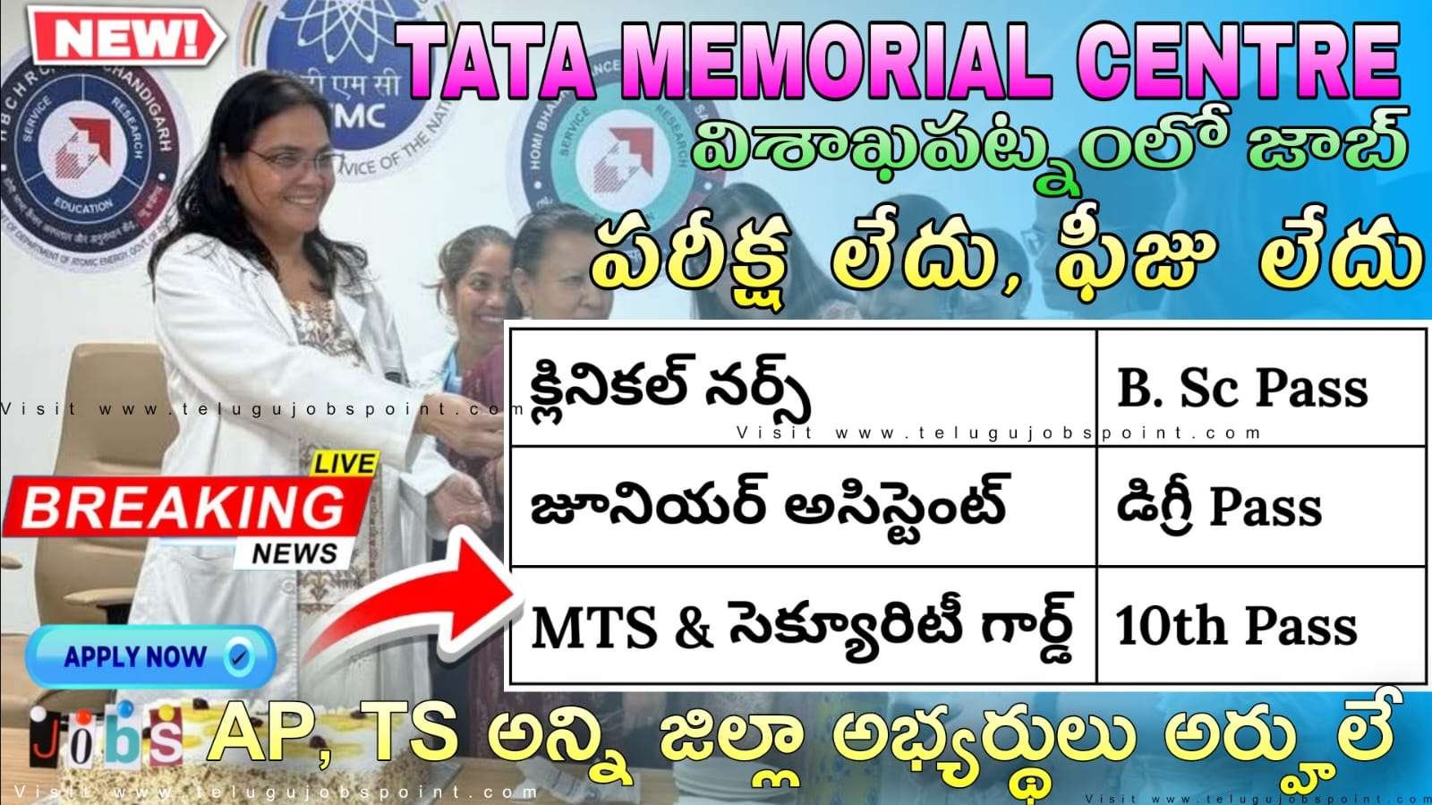 Τata Μemorial Centre Recruitment 2025 Latest Assistant, Security Guard, Driver, Nurse & Multitasking Staff Jobs Notification Check All Details and Apply Here : ప్రెండ్స్ ఈరోజు మీకోసం టాటా మెమోరియల్ సెంటర్, హోమి బాబా క్యాన్సర్ హాస్పిటల్ రీసెర్చ్ సెంటర్, విశాఖపట్నం లో కొత్త నోటిఫికేషన్ తీసుకొచ్చాను. ఈ Sr. మెడికల్ ఆఫీసర్ & ప్రాజెక్ట్ కోఆర్డినేటర్, క్లినికల్ నర్స్, అడ్మినిస్ట్రేటివ్ అసిస్టెంట్, సెక్యూరిటీ గార్డ్, డ్రైవర్ & మల్టీతాస్కింగ్ స్టాఫ్ ఉద్యోగాలకు వాక్-ఇన్ ఇంటర్వ్యూ ద్వారా సెలక్షన్ చేస్తారు. గోల్డెన్ చాన్స్ వెంటనే అప్లై చేసుకోండి.