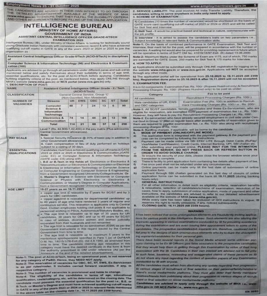 హోం మంత్రిత్వ శాఖ పరిధిలోని ఇంటెలిజెన్స్ బ్యూరో (IB), సంస్థలో చేరడానికి స్థిరమైన విద్యా రికార్డు కలిగిన మరియు 2023 లేదా 2024 లేదా 2025 సంవత్సరాల్లో ఏదైనా సంవత్సరంలో అసిస్టెంట్ సెంట్రల్ ఇంటెలిజెన్స్ ఆఫీసర్ గ్రేడ్-II/టెక్ (ACIO-II/టెక్) విభాగాలలో కంప్యూటర్ సైన్స్ & ఇన్ఫర్మేషన్ టెక్నాలజీ (90) మరియు ఎలక్ట్రానిక్స్ & కమ్యూనికేషన్ (168) పోస్టులు GATEలో అర్హత సాధించిన కటాఫ్ మార్కులు సాధించిన సాంకేతికంగా మంచి యువ గ్రాడ్యుయేట్ ఇండియన్ నేషనల్స్ కోసం చూస్తోంది. దరఖాస్తు చేసుకునే ముందు, దరఖాస్తుదారులు ACIO-II/టెక్ పోస్టుకు వయోపరిమితి, అవసరమైన అర్హతలు మొదలైన వాటి పరంగా వారి అనుకూలత గురించి సంతృప్తి చెందాలని, క్రింద పేర్కొన్న వివిధ పేరాలు మరియు ఉప పేరాల కింద ఉన్న అన్ని పారామితులను పరిశీలించాలని సూచించారు. క్రింద పేర్కొన్న విధంగా పోస్ట్ యొక్క అర్హత ప్రమాణాలను పూర్తి చేసిన అభ్యర్థులు, MHA వెబ్సైట్ (www.mha.gov.in) లేదా NCS పోర్టల్ (www.ncs.gov.in) ద్వారా మాత్రమే ఆన్లైన్లో దరఖాస్తు చేసుకోవచ్చు.