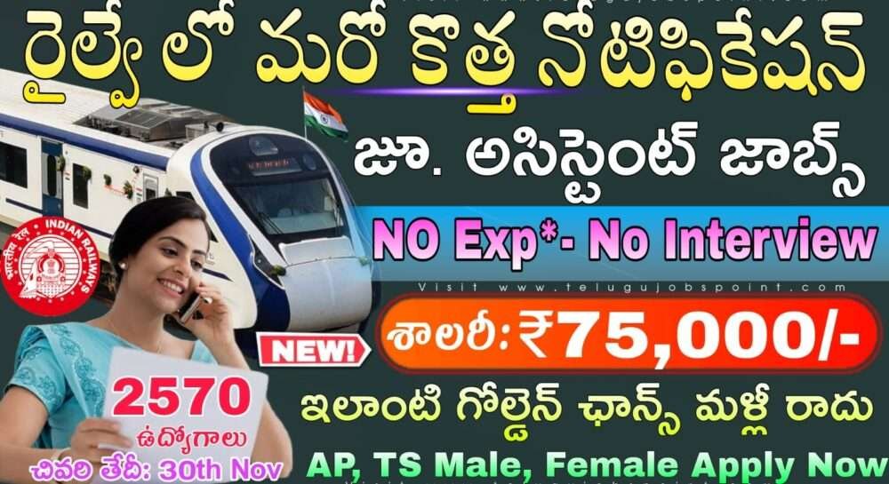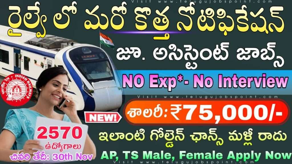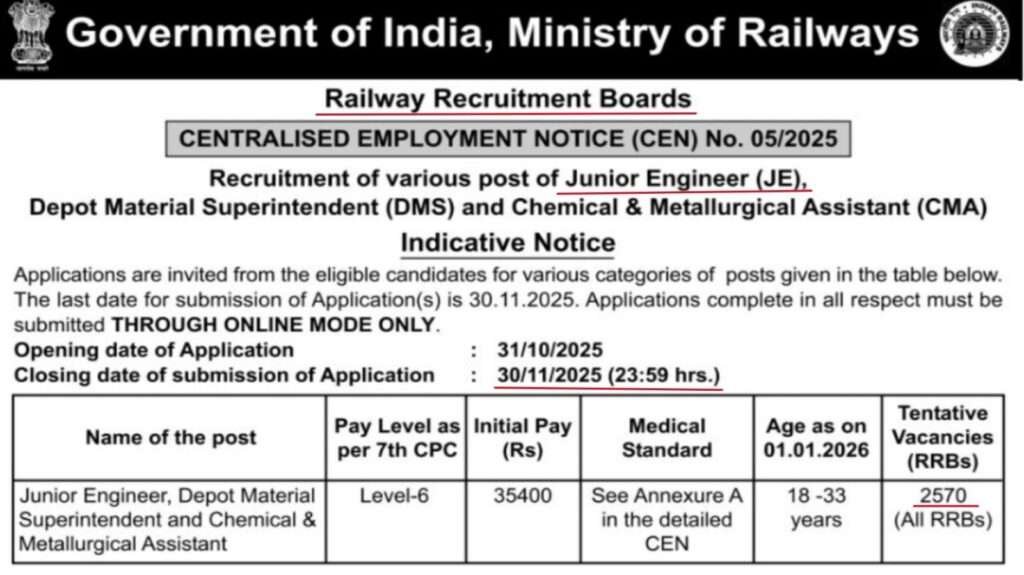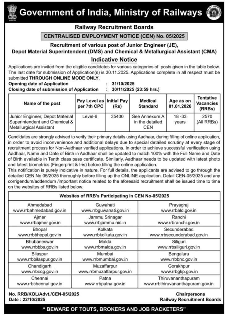 Railway Recruitment Board Junior Engineer (JE) Recruitment 2025: Short Notification Out for 2570 Posts, Apply Start From 31 October : భారత ప్రభుత్వం, రైల్వే మంత్రిత్వ శాఖ, రైల్వే రిక్రూట్మెంట్ బోర్డు (RRB) లో జూనియర్ ఇంజనీర్ (JE) 2570 ఉద్యోగుల కోసం షార్ట్ నోటిఫికేషన్ విడుదల చేశారు. దరఖాస్తు ప్రారంభ తేదీ 31/10/2025 to దరఖాస్తు సమర్పణ ముగింపు తేదీ 30/11/2025 (రాత్రి 23:59 గంటలు) లోపు https://indianrailways.gov.in/ ఆన్లైన్ లో అప్లై చేయాలి.