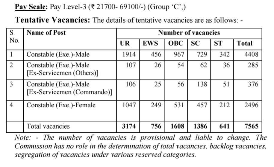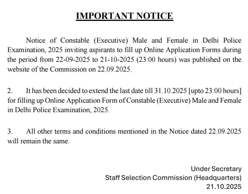 స్టాఫ్ సెలక్షన్ కమిషన్ (SSC) 4,408 పోస్టులు కానిస్టేబుల్ (ఎగ్జిక్యూటివ్) పురుషులు, 2,496 పోస్టులు కానిస్టేబుల్ (ఎగ్జిక్యూటివ్) మహిళలు, 285 పోస్టులు కానిస్టేబుల్ (ఎగ్జిక్యూటివ్) పురుషులు ఎక్స్ సర్వీస్మెన్ (ఇతరులు), 376 పోస్టుల కానిస్టేబుల్ (ఎగ్జిక్యూటివ్) పురుషులు ఎక్స్ సర్వీస్మెన్ (కమాండో) ఉద్యోగాలు అయితే 7565 ఖాళీలు అయితే ఉన్నాయి. ఈ ఉద్యోగాలకి అప్లై చేసుకోవడానికి 20 సెప్టెంబర్ నుంచి 21 అక్టోబర్ చివరి తేదీ ఇవ్వడం జరిగింది కానీ 31 అక్టోబర్ 2025 వరకు గడువు పెంచుతూ అధికారికంగా SSC విడుదల చేసింది.