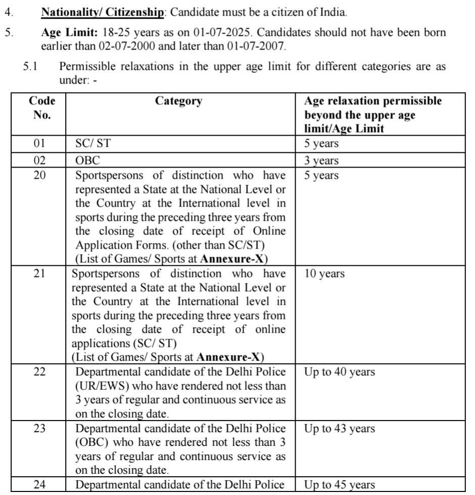 SSC నోటిఫికేషన్ కోసం వయోపరిమితి 01-07-2025 నాటికి 18-25 సంవత్సరాలు. అభ్యర్థులు 02-07-2000 కంటే ముందు మరియు 01-07-2007 తర్వాత జన్మించి ఉండకూడదు. వివిధ వర్గాలకు గరిష్ట వయోపరిమితిలో అనుమతించదగిన సడలింపులు క్రింది విధంగా ఉన్నాయి. ఈ ఉద్యోగులకు ఎంపిక విధానం కంప్యూటర్ బీచ్డ్ ఎగ్జామ్ (CBT), ఫిసికల్ ఇందూరాన్స్ & మీసు్రిమెంట్ టెస్ట్ (PE&MT), మెడికల్ పరీక్ష & డాక్యుమెంట్ వెరిఫికేషన్ ఆధారంగా సెలక్షన్ ఉంటుంది. అర్హులు అయితే వెంటనే అప్లై చేసుకోండి. ఢిల్లీ పోలీస్ పరీక్ష, 2025 లో కానిస్టేబుల్ (ఎగ్జిక్యూటివ్) పురుష మరియు స్త్రీల ఆన్లైన్ దరఖాస్తు ఫారమ్ను పూరించడానికి చివరి తేదీని 31.10.2025 వరకు [23:00 గంటల వరకు] పొడిగించాలని నిర్ణయించారు.