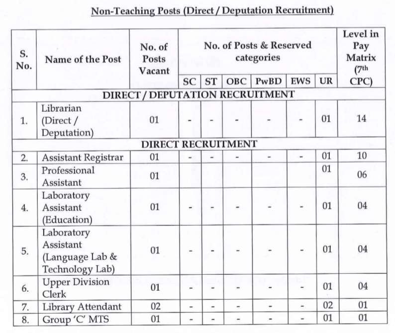 • లాబొరేటరీ అసిస్టెంట్ (ఎడ్యుకేషన్) = గుర్తింపు పొందిన విశ్వవిద్యాలయం నుండి శిక్షా శాస్త్రి/విద్యలో బ్యాచిలర్ డిగ్రీ (బి. ఎడ్). ఏదైనా కేంద్ర/రాష్ట్ర ప్రభుత్వ విద్యా విభాగంలో ప్రయోగశాల పనులలో ఒక సంవత్సరం అనుభవం సంస్థ/విశ్వవిద్యాలయాలు లేదా ఏదైనా ఇతర ప్రసిద్ధ సంస్థ. కంప్యూటర్ పరిజ్ఞానం.