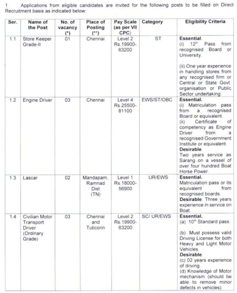 •Engine డ్రైవర్ : గుర్తింపు పొందిన బోర్డు లేదా తత్సమానం నుండి మెట్రిక్యులేషన్ ఉత్తీర్ణత. ఇన్స్టిట్యూట్ నుండి డ్రైవర్ సర్టిఫికేట్ లేదా తత్సమానం. ఇంజిన్గా ప్రభుత్వం గుర్తించిన సామర్థ్యం కావాల్సినది. నాలుగు వందలకు పైగా బోట్ హార్స్పవర్ కలిగిన ఓడలో సారంగ్గా రెండు సంవత్సరాల సేవ