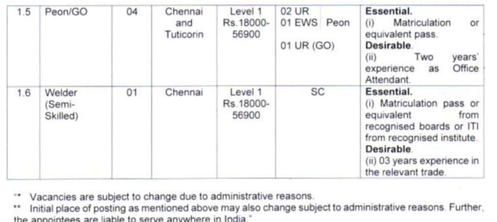 •వెల్డర్ : గుర్తింపు పొందిన బోర్డుల నుండి మెట్రిక్యులేషన్ పాస్ లేదా తత్సమానం లేదా గుర్తింపు పొందిన సంస్థ నుండి ITI. కావాల్సినది. సంబంధిత ట్రేడ్లో 03 సంవత్సరాల అనుభవం.