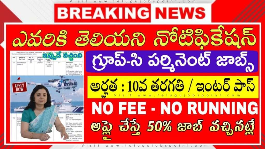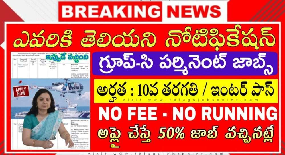 ఇండియన్ కోస్ట్ గార్డ్ సివిలియన్ పోస్టుల భర్తీకి డైరెక్ట్ రిక్రూట్మెంట్ ప్రాతిపదికన భర్తీ చేయడానికి అర్హత కలిగిన అభ్యర్థుల నుండి దరఖాస్తులు ఆహ్వానించబడ్డాయి. ఈ నోటిఫికేషన్ లో SSC/ 10వ తరగతి, ITI, & 12th అర్హత కలిగిన అభ్యర్థులు అప్లై చేసుకోవచ్చు. జీతం ₹25,500/- to ₹81,100/- మధ్యలో నెల జీతం ఇస్తారు. అప్లై చేసుకోవడానికి ఎటువంటి అప్లికేషన్ ఫీజు చెల్లించని అవసరం లేదు ఒక రాత ప్రశ్న ద్వారా పెర్మనెంట్ ఇండియన్ పోస్ట్ కార్డులో సివిల్ ఉద్యోగాలు రావడం జరిగింది. ఇలాంటి గోల్డెన్ ఛాన్స్ మిస్ కాకండి అర్హులు అయితే వెంటనే అప్లై చేసుకోండి. మన పక్క రాష్ట్ర మైనటువంటి చెన్నైలో పోస్టింగ్ ఉంటుంది. చివరి తేదీ డిసెంబర్ 6 లోపల ఆఫ్ లైన్ లో అప్లై చేసుకోవాలి. మరిన్ని వివరాల కోసం పూర్తి ఆర్టికల్ చదవండి.