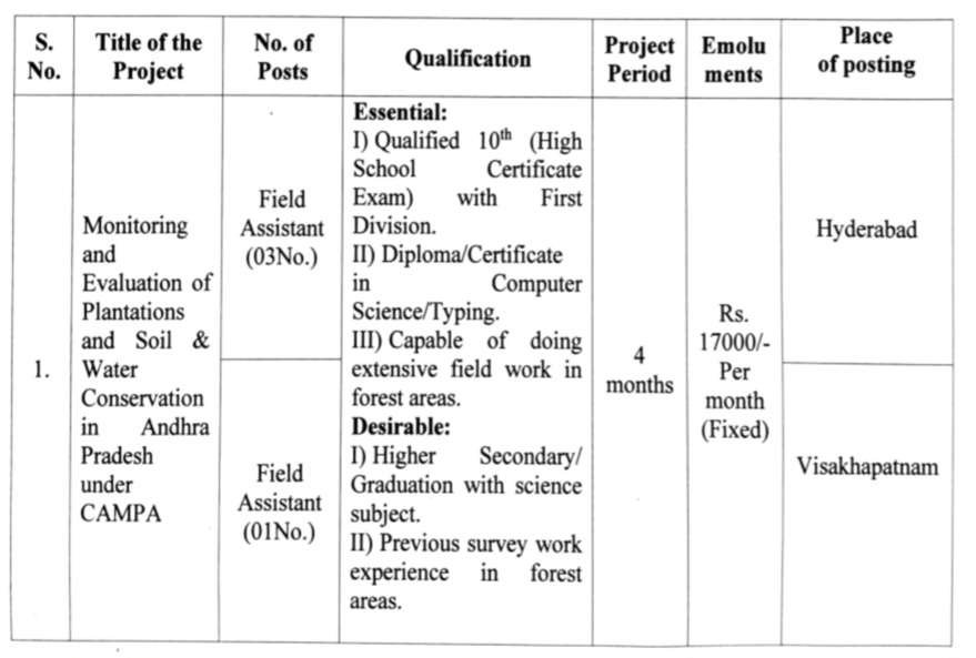 విద్యార్హత : ఫస్ట్ డివిజన్తో 10వ తరగతి (హై స్కూల్ సర్టిఫికేట్ పరీక్ష) అర్హత సాధించాలి. కంప్యూటర్ సైన్స్/టైపింగ్లో డిప్లొమా/సర్టిఫికెట్. అటవీ ప్రాంతాలలో విస్తృతమైన క్షేత్రస్థాయి పని చేయగల సామర్థ్యం. కావాల్సినది: సైన్స్ సబ్జెక్టుతో హయ్యర్ సెకండరీ/గ్రాడ్యుయేషన్. అటవీ ప్రాంతాలలో మునుపటి సర్వే పని అనుభవం.