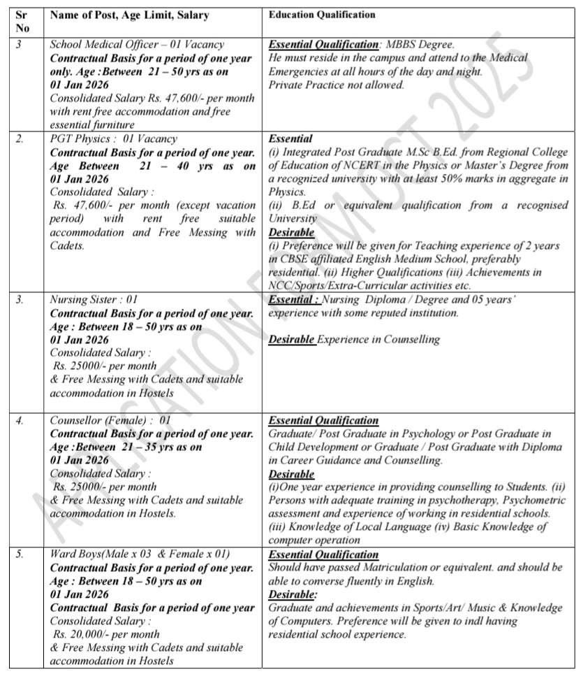 Sainik School Balachadi Recruitment 2025 Latest Ward Boys Job Notification Apply Now : నిరుద్యోగులకు భారీ శుభవార్త.. అద్దె ఉచిత వసతి మరియు ఉచితం.. కేవలం పదో తరగతి పాసైన అభ్యర్థుల అప్లై చేసుకోవచ్చు. సైనిక్ స్కూల్ బాలాచాడిలో ఒప్పంద ప్రాతిపదికన స్కూల్ మెడికల్ ఆఫీసర్, PGT ఫిజిక్స్, నర్సింగ్ సోదరి, కౌన్సెలర్ & వార్డ్ బాయ్స్ ఖాళీల కోసం దరఖాస్తులు ఆహ్వానించబడ్డాయి. అర్హత కలిగిన అభ్యర్థులు 17 నవంబర్ 2025 లోపు అప్లై చేయాలి.