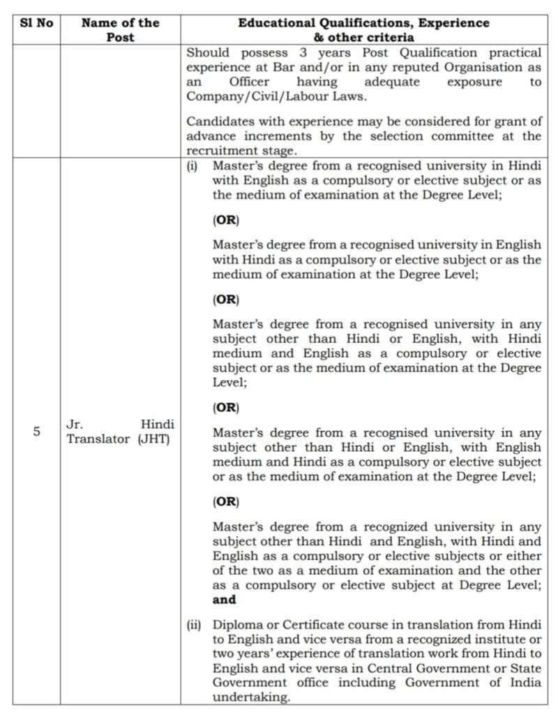 జూనియర్ హిందీ అనువాదకుడు (JHT) : గుర్తింపు పొందిన విశ్వవిద్యాలయం నుండి హిందీలో మాస్టర్స్ డిగ్రీ, ఇంగ్లీషును తప్పనిసరి లేదా ఎంపిక చేసిన సబ్జెక్టుగా లేదా డిగ్రీ స్థాయిలో పరీక్షా మాధ్యమంగా (OR) గుర్తింపు పొందిన విశ్వవిద్యాలయం నుండి ఇంగ్లీష్‌లో మాస్టర్స్ డిగ్రీ, హిందీని తప్పనిసరి లేదా ఎంపిక చేసిన సబ్జెక్టుగా లేదా డిగ్రీ స్థాయిలో పరీక్షా మాధ్యమంగా (OR) గుర్తింపు పొందిన విశ్వవిద్యాలయం నుండి హిందీ లేదా ఇంగ్లీష్ కాకుండా ఏదైనా సబ్జెక్టులో మాస్టర్స్ డిగ్రీ, హిందీ మాధ్యమం మరియు ఇంగ్లీష్ తప్పనిసరి లేదా ఎంపిక సబ్జెక్టుగా లేదా డిగ్రీ స్థాయిలో పరీక్షా మాధ్యమంగా.