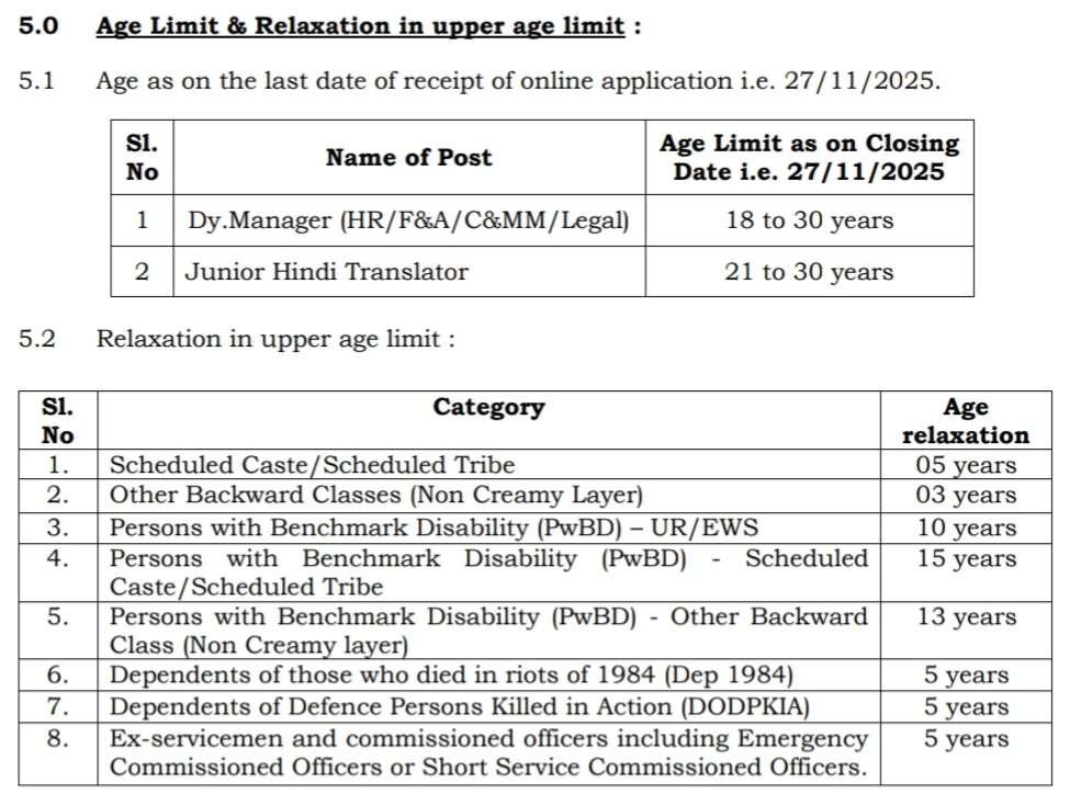 వయోపరిమితి: 27/11/2025 నాటికి వయోపరిమితి డిప్యూటీ మేనేజర్ (HR/F&A/C&MM/లీగల్) 18 నుండి 30 సంవత్సరాలు & జూనియర్ హిందీ అనువాదకుడు 21 నుండి 30 సంవత్సరాలు మధ్య వయసు కలిగి ఉండాలి.