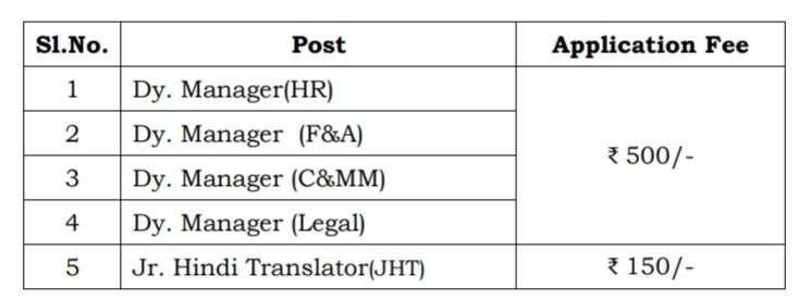 దరఖాస్తు రుసుము: డిప్యూటీ మేనేజర్ (హెచ్ఆర్), డిప్యూటీ మేనేజర్ (ఎఫ్&ఎ), డిప్యూటీ మేనేజర్ (సి & ఎంఎం) & డిప్యూటీ మేనేజర్ (లీగల్) ₹500/- & జూనియర్ హిందీ అనువాదకుడు (JHT) 150/- అప్లికేషన్ ఫీజు చెల్లించవలసి ఉంటుంది.