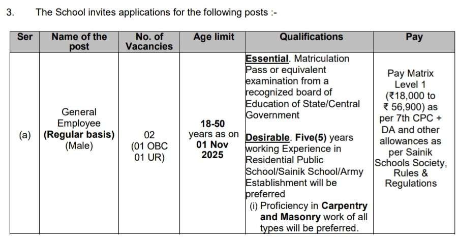 Sainik School General Employee Regular basis Recruitment 2025 Apply 02 Vacancy Overview :