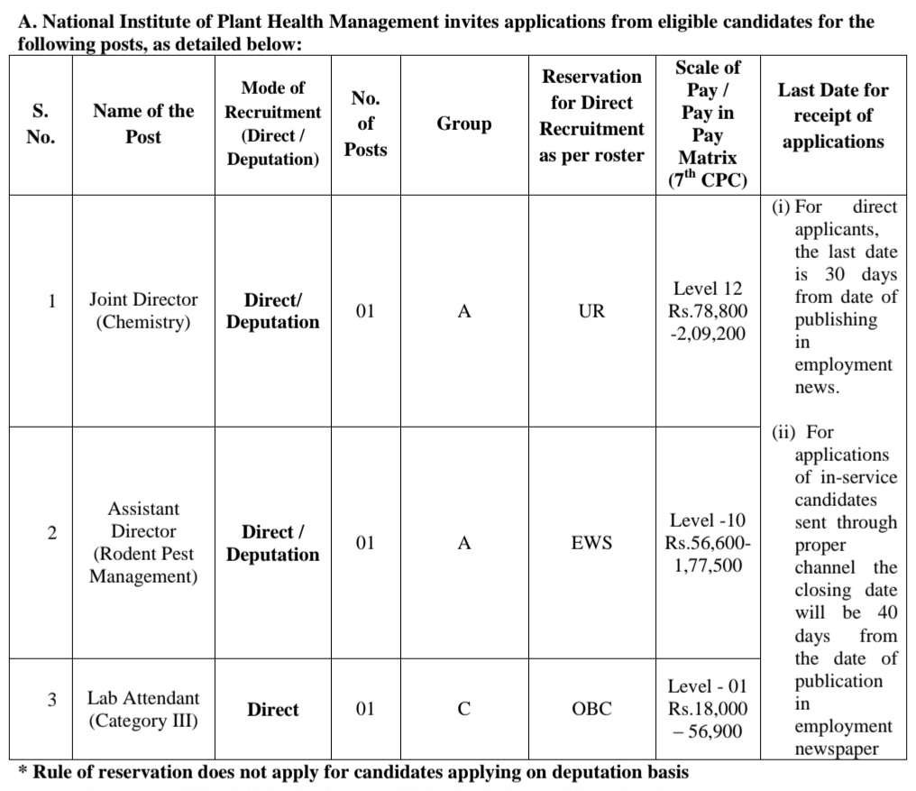 నేషనల్ ఇన్‌స్టిట్యూట్ ఆఫ్ ప్లాంట్ హెల్త్ మేనేజ్‌మెంట్ (NIPHM) లో వ్యవసాయం మరియు రైతు సంక్షేమ శాఖ వ్యవసాయం మరియు రైతు సంక్షేమ మంత్రిత్వ శాఖ లో జాయింట్ డైరెక్టర్ (కెమిస్ట్రీ), అసిస్టెంట్ డైరెక్టర్ & ల్యాబ్ అటెండెంట్ డిప్యుటేషన్ & డైరెక్ట్ ప్రాతిపదికన దరఖాస్తు చేసుకునే అభ్యర్థులకు రిజర్వేషన్ నియమం వర్తించదు. పదోతరగతి పాస్ అయిన అభ్యర్థులు అప్లై చేసుకోవచ్చు. వయస్సు 18 సంవత్సరాల నుంచి 55 సంవత్సరాల మధ్యలో వయసు కలిగి ఉండాలి. నెల జీతం రూ.18,000/- to రూ.2,09,200/- నెల జీతం ఇస్తారు. దరఖాస్తు ప్రొఫార్మాతో పాటు విద్యార్హతలు, అనుభవం, వయస్సు మరియు ఇతర అర్హత ప్రమాణాలు మొదలైన వివరాలను http://niphm.gov.in వెబ్‌సైట్ నుండి పొందవచ్చు.