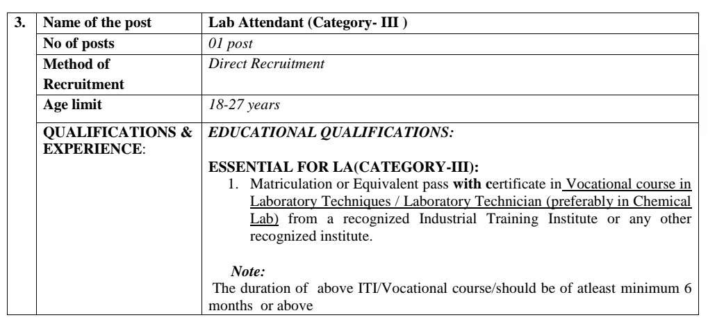 ల్యాబ్ అటెండెంట్ (కేటగిరీ-III) : గుర్తింపు పొందిన ఇండస్ట్రియల్ ట్రైనింగ్ ఇన్స్టిట్యూట్ లేదా ఏదైనా ఇతర గుర్తింపు పొందిన ఇన్స్టిట్యూట్ నుండి లాబొరేటరీ టెక్నిక్స్/లాబొరేటరీ టెక్నీషియన్ (ప్రాధాన్యంగా కెమికల్ ల్యాబ్‌లో) ఒకేషనల్ కోర్సులో సర్టిఫికెట్‌తో పాటు మెట్రిక్యులేషన్ లేదా తత్సమాన ఉత్తీర్ణత.