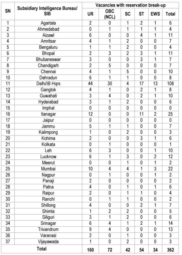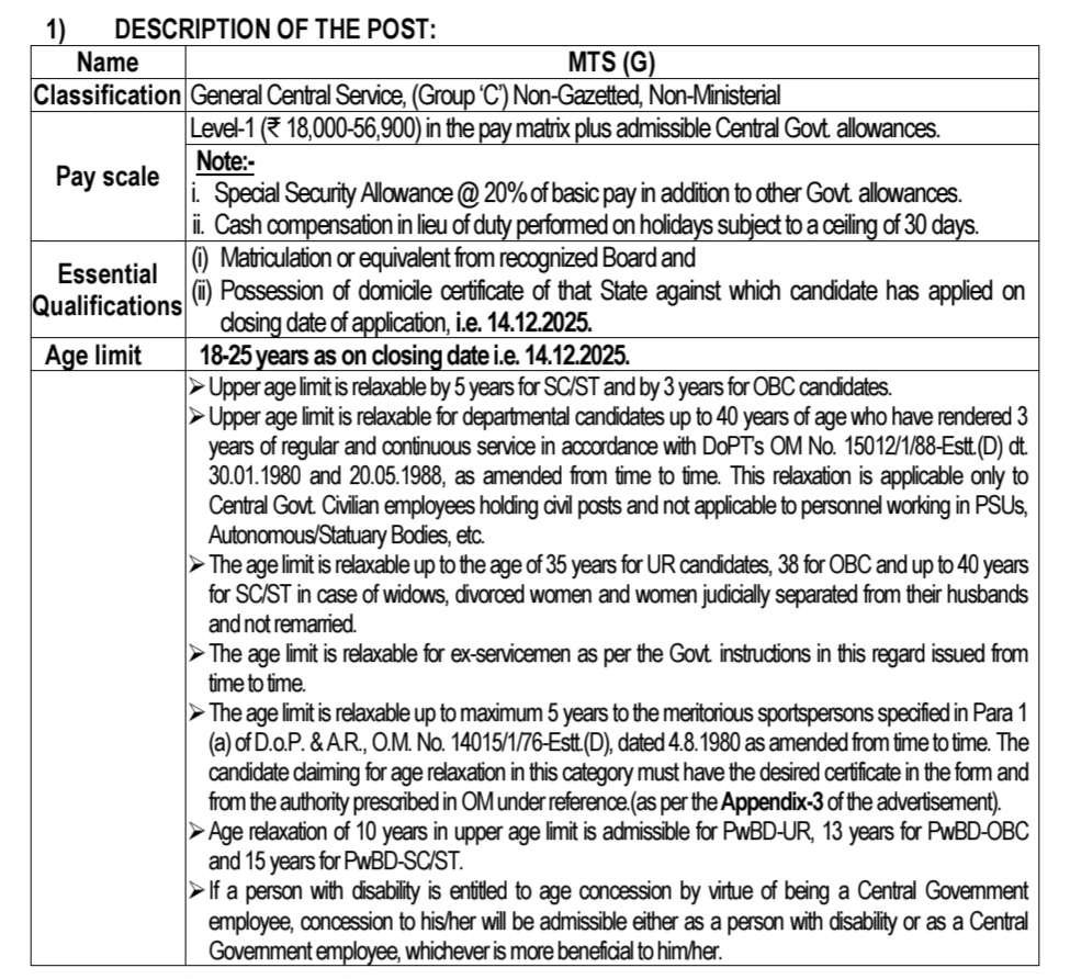 భారత ప్రభుత్వ అనుబంధ ఇంటెలిజెన్స్ బ్యూరో (హోం వ్యవహారాల మంత్రిత్వ శాఖ)లో మల్టీ-టాస్కింగ్ స్టాఫ్ (జనరల్) (MTS(G)) పోస్టులకు ప్రత్యక్ష నియామకం కోసం భారతీయ పౌరుల నుండి ఆన్‌లైన్ దరఖాస్తులు ఆహ్వానించబడ్డాయి. ఈ నోటిఫికేషన్ కి కేవలం 10వ తరగతి పాస్ అయితే చాలు, పెర్మనెంట్ గవర్నమెంట్ ఉద్యోగం పొందే అవకాశం. మొత్తం పోస్టులు 362 పోస్టులు ఉన్నాయి. 14.12.2025 నాటికి 18-25 సంవత్సరాలు మధ్య వయసు కలిగి ఉండాలి. ముగింపు తేదీకి లేదా అంతకు ముందు, అంటే 14.12.2025 (2359 గంటల వరకు) పోస్ట్ యొక్క అర్హత ప్రమాణాలను పూర్తి చేసిన అభ్యర్థులు MHA వెబ్‌సైట్ (www.mha.gov.in) లేదా NCS పోర్టల్ (www.ncs.gov.in) ద్వారా మాత్రమే ఆన్‌లైన్‌లో దరఖాస్తు చేసుకోవచ్చు.