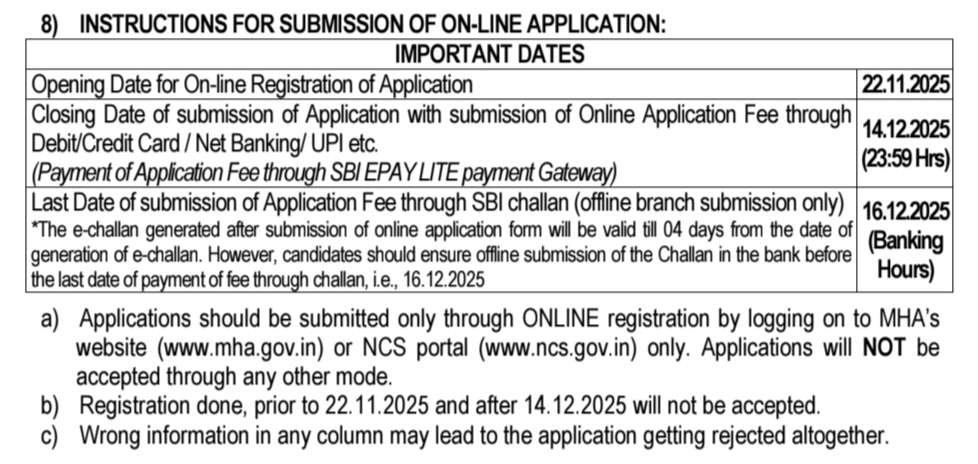 »ఎలా దరఖాస్తు చేయాలి : దరఖాస్తులను MHA లకు లాగిన్ అవ్వడం ద్వారా ఆన్‌లైన్ రిజిస్ట్రేషన్ ద్వారా మాత్రమే సమర్పించాలి. వెబ్‌సైట్ (www.mha.gov.in) లేదా NCS పోర్టల్ (www.ncs.gov.in) ద్వారా మాత్రమే దరఖాస్తులు స్వీకరించబడవు. ఇతర ఏ విధంగానూ దరఖాస్తులు అంగీకరించబడవు. 22.11.2025 కి ముందు మరియు 14.12.2025 తర్వాత చేసిన రిజిస్ట్రేషన్ అంగీకరించబడదు. ఏదైనా కాలమ్‌లో తప్పు సమాచారం దరఖాస్తును పూర్తిగా తిరస్కరించడానికి దారితీయవచ్చు.