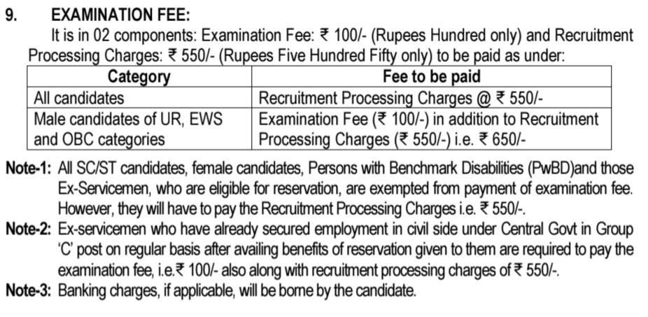 »దరఖాస్తు రుసుము:  అప్లికేషన్ ఫీజు UR, EWS మరియు OBC వర్గాల పురుష అభ్యర్థులు నియామకానికి అదనంగా పరీక్ష రుసుము (100/-) ప్రాసెసింగ్ ఛార్జీలు (550/-) అంటే ₹650/- & మిగిలిన అభ్యర్థులకు నియామక ప్రాసెసింగ్ ఛార్జీలు @ 550/- చెల్లించాలి. డెబిట్ కార్డులు (రుపే/వీసా/మాస్టర్ కార్డ్/మాస్ట్రో), క్రెడిట్ కార్డులు, ఇంటర్నెట్ బ్యాంకింగ్, UPI, SBI చలాన్ మొదలైన వాటి ద్వారా SBI EPAY LITE ద్వారా ఆన్‌లైన్‌లో చెల్లింపు చేయవచ్చు.