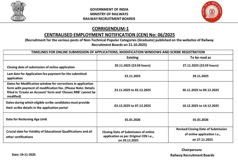 RRB NTPC Graduate Level Recruitment 2025 Latest Station Master Job Notification Apply Last Date Extended : నిరుద్యోగులకు మరొక అవకాశం.. RRB భారత ప్రభుత్వం, రైల్వే మంత్రిత్వ శాఖ లో రైల్వే రిక్రూట్మెంట్ బోర్డు (RRB) లో వెబ్సైట్లలో ప్రచురించబడిన నాన్-టెక్నికల్ పాపులర్ కేటగిరీల (గ్రాడ్యుయేట్) టికెట్ కమర్షియల్ సూపర్వైజర్, గూడ్స్ రైలు మేనేజర్, స్టేషన్ మాస్టర్, సీనియర్ క్లర్క్ కమ్ టైపిస్ట్, జూనియర్ అకౌంట్స్ అసిస్టెంట్ కమ్ టైపిస్ట్, ట్రాఫిక్ అసిస్టెంట్ వివిధ పోస్టుల కోసం నియామకాలు) కోసం 20 నవంబర్ 2025 (రాత్రి 3:59 గంటలు) దరఖాస్తు ముగించింది. కానీ ఆన్లైన్ దరఖాస్తు చివరి తేదీ పొడగింపు 27 నవంబర్ 2025 (రాత్రి 3:59 గంటలు) లోపు https://rrbchennai.gov.in/ ఆన్లైన్ లో అప్లై చేయాలి.