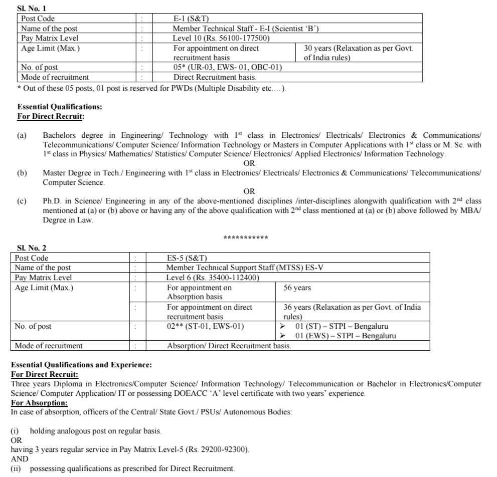 •Member Technical Staff-E-1 (Scientist “B”) :: ఎలక్ట్రానిక్స్/ ఎలక్ట్రికల్స్ ఎలక్ట్రానిక్స్ & కమ్యూనికేషన్స్/ టెలికమ్యూనికేషన్స్/ కంప్యూటర్ సైన్స్/ ఇన్ఫర్మేషన్ టెక్నాలజీలో 1 తరగతితో ఇంజనీరింగ్ టెక్నాలజీలో బ్యాచిలర్ డిగ్రీ లేదా కంప్యూటర్ అప్లికేషన్స్లో మాస్టర్స్ డిగ్రీ లేదా ఫిజిక్స్/ మ్యాథమెటిక్స్/ స్టాటిస్టిక్స్/ కంప్యూటర్ సైన్స్/ ఎలక్ట్రానిక్స్/ అప్లైడ్ ఎలక్ట్రానిక్స్/ ఇన్ఫర్మేషన్ టెక్నాలజీలో 15 తరగతితో ఎం.ఎస్.సీ. లేదా ఎలక్ట్రానిక్స్/ఎలక్ట్రికల్స్/ఎలక్ట్రానిక్స్ & కమ్యూనికేషన్స్ టెలికమ్యూనికేషన్స్/కంప్యూటర్ సైన్స్లో 1 తరగతితో టెక్/ఇంజనీరింగ్లో మాస్టర్ డిగ్రీ. లేదా పైన పేర్కొన్న విభాగాలు/ఇంటర్-డిసిప్లిన్లలో ఏదైనా ఒకదానిలో సైన్స్/ఇంజనీరింగ్లో పిహెచ్డి. (ఎ) లేదా (బి)లో పేర్కొన్న 2వ తరగతితో అర్హతతో పాటు లేదా పైన పేర్కొన్న 2వ తరగతితో (ఎ) లేదా (బి)లో పేర్కొన్న 2వ తరగతితో పైన పేర్కొన్న అర్హతలో ఏదైనా కలిగి ఉండాలి, ఆపై ఎంబీఏ/లాలో డిగ్రీ ఉండాలి.