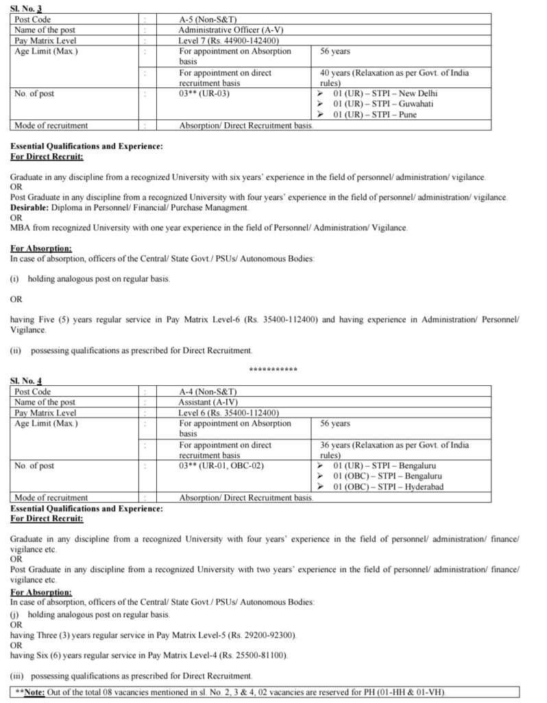 సాఫ్ట్వేర్ టెక్నాలజీ పార్క్స్ ఆఫ్ ఇండియా (STPI) అనేది ఎలక్ట్రానిక్స్ మరియు ఇన్ఫర్మేషన్ టెక్నాలజీ మంత్రిత్వ శాఖలో సభ్యుడు సాంకేతిక సిబ్బంది, అడ్మినిస్ట్రేటివ్ ఆఫీసర్, సభ్యుడు సాంకేతిక సహాయ సిబ్బంది (MTSS), అసిస్టెంట్ (A-III), అసిస్టెంట్ (A-II) & ఆఫీస్ అటెండెంట్ (S-I) ఉద్యోగుల కోసం నోటిఫికేషన్ విడుదల చేశారు. ఈ నోటిఫికేషన్ లో టెన్త్ ఏదైనా డిగ్రీ డిప్లమా అర్హతతో ప్రతి ఒక్కరు కూడా అప్లై చేసుకోవచ్చు. అప్లై చేస్తే సొంత రాష్ట్రంలో హైదరాబాదులో మీకు జాబ్ లొకేషన్ వస్తుంది. పర్మనెంట్ జాబ్స్ తప్పనిసరిగా అప్లై చేసుకోండి. పోస్టులను అనుసరించి రూ.56,100/- to ₹1,77,500/- మధ్యలో నెల జీతం ఇస్తారు. కేంద్ర ప్రభుత్వ పర్మనెంట్ ఉద్యోగాలు డైరెక్ట్ రిక్రూమెంట్ చేస్తున్నారు వెంటనే అప్లై చేసుకోండి. ఆన్లైన్ దరఖాస్తు సమర్పణ ప్రారంభ తేదీ 29.11.2025 & ఆన్లైన్ దరఖాస్తు అందిన చివరి/ముగింపు తేదీ 12.01.2026 లోపు ఆన్లైన్ లో www.stpi.inలో అప్లై చేయాలి.