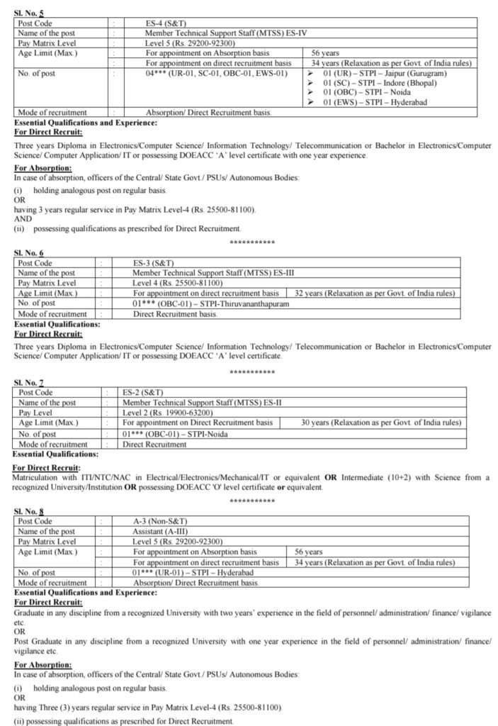 •టెక్నికల్ సపోర్ట్ స్టాఫ్ (MTSS) ES-IV :: మూడు సంవత్సరాలు. ఎలక్ట్రోమ్స్ / కంప్యూటర్ సైన్స్/ఇన్ఫర్మేషన్ టెక్నాలజీ/టెలికమ్యూనికేషన్లో డిప్లొమా లేదా ఎలక్ట్రానిక్స్/కంప్యూటర్ సైన్స్ కంప్యూటర్ అప్లికేషన్ ఐటీలో బ్యాచిలర్ లేదా DOEACC ‘A’ లెవల్ సర్టిఫికెట్ కలిగి ఉండి ఒక సంవత్సరం అనుభవం కలిగి ఉండాలి.