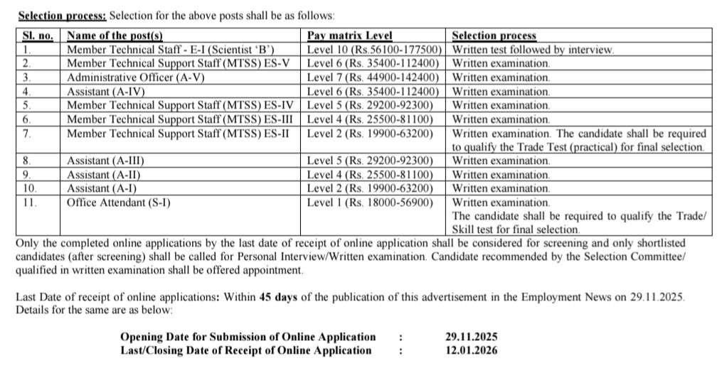 •సభ్యుడు సాంకేతిక సిబ్బంది – E-I (సైంటిస్ట్ ‘B’), సభ్యుడు సాంకేతిక మద్దతు సిబ్బంది (MTSS) ES-V, అడ్మినిస్ట్రేటివ్ ఆఫీసర్ (A-V), అసిస్టెంట్ (A-IV), టెక్నికల్ సపోర్ట్ స్టాఫ్ (MTSS) ES-IV, టెక్నికల్ సపోర్ట్ స్టాఫ్ (MTSS) ES-III, సభ్యుడు సాంకేతిక మద్దతు సిబ్బంది (MTSS) ES-II, అసిస్టెంట్ (A-III), అసిస్టెంట్ (A-II), అసిస్టెంట్ (A-I) & ఆఫీస్ అటెండెంట్ (S-I) ఉద్యోగాలు ఉన్నాయి. మొత్తం 24 పోస్టులు భర్తీ.