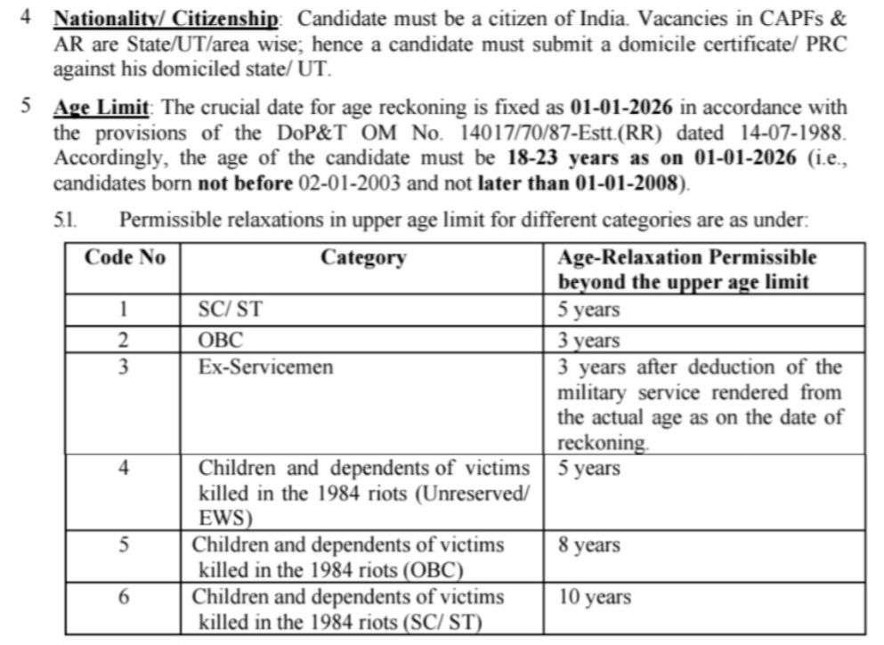»వయోపరిమితి: అభ్యర్థి వయస్సు 01-01-2026 నాటికి 18-23 సంవత్సరాలు ఉండాలి (అంటే, అభ్యర్థులు 02-01-2003 కంటే ముందు మరియు 01-01-2008 తర్వాత జన్మించకూడదు). వివిధ వర్గాలకు గరిష్ట వయోపరిమితిలో అనుమతించదగిన సడలింపులు.
