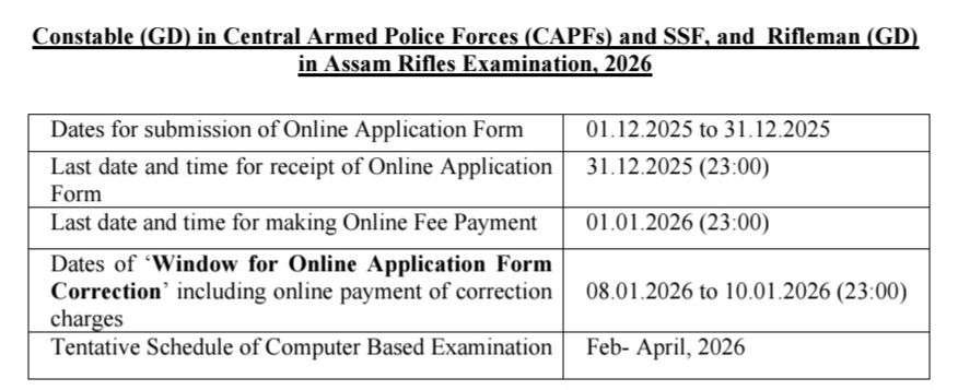 •25487 పోస్టులతో సెంట్రల్ ఆర్మ్డ్ పోలీస్ ఫోర్సెస్ (CAPFలు) మరియు SSFలో కానిస్టేబుల్ (GD), మరియు అస్సాం రైఫిల్స్ పరీక్షలో రైఫిల్మన్ (GD), 2026