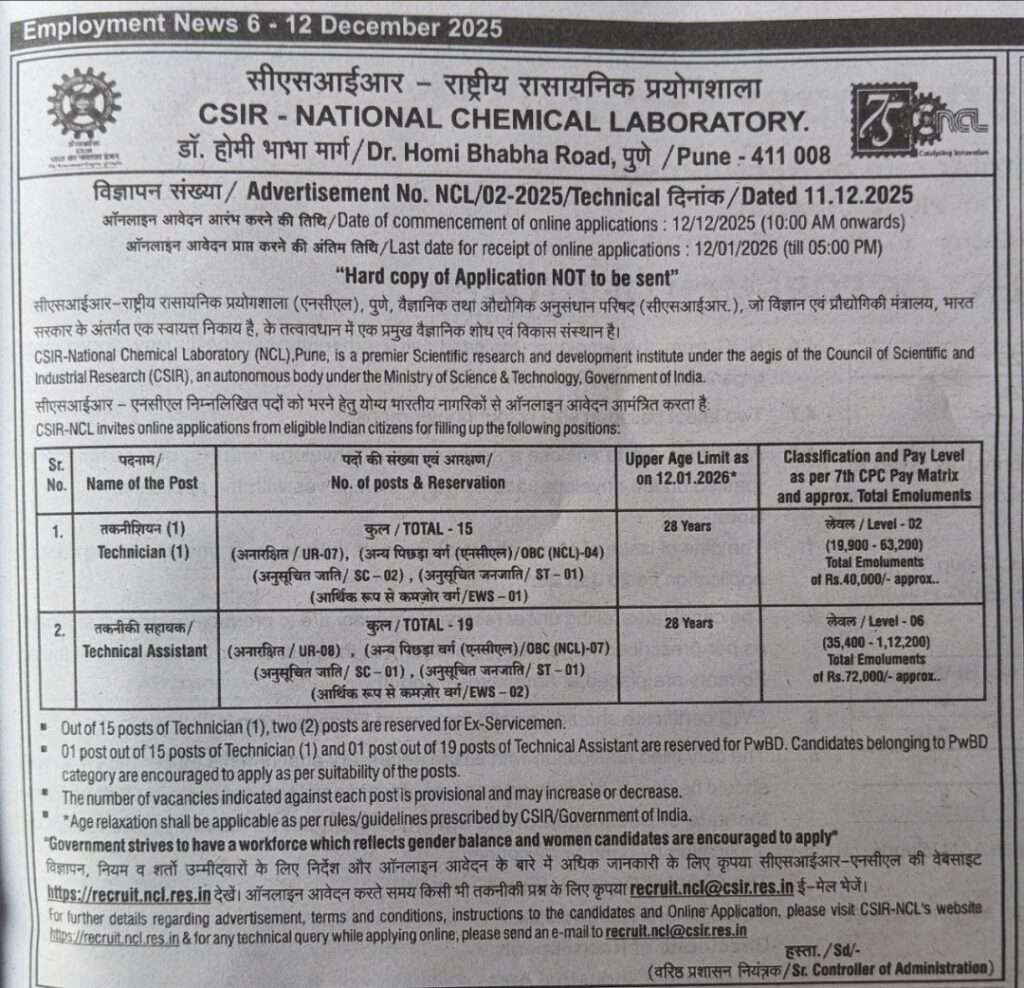 CSIR NCL Recruitment 2025 Latest Technician & Technical Assistant Job Notification 2025 Apply Now : CSIR-నేషనల్ కెమికల్ లాబొరేటరీ (NCL), భారత ప్రభుత్వ సైన్స్ & టెక్నాలజీ మంత్రిత్వ శాఖ లో టెక్నీషియన్ & టెక్నికల్ అసిస్టెంట్ 34 పోస్టుల భర్తీకి అర్హులైన భారతీయ పౌరుల నుండి ఆన్‌లైన్ దరఖాస్తులను ఆహ్వానిస్తుంది. 10th, ITI, డిగ్రీ లేదా డిప్లమా అర్హత కలిగిన అభ్యర్థులు అప్లై చేసుకోవచ్చు. సర్టిఫికెట్ ఉంటే చాలు అనుభవం అక్కర్లేదు. ఆన్‌లైన్ దరఖాస్తుల ప్రారంభ తేదీ 12/12/2025 (10:00 AM నుండి) & ఆన్‌లైన్ దరఖాస్తుల స్వీకరణకు చివరి తేదీ 12/01/2026 (సాయంత్రం 05:00 వరకు) అభ్యర్థులకు సూచనలు మరియు ఆన్‌లైన్ దరఖాస్తుకు సంబంధించిన మరిన్ని వివరాల కోసం, దయచేసి CSIR-NCL వెబ్‌సైట్ ps://recruit.ncl.res ని సందర్శించండి.