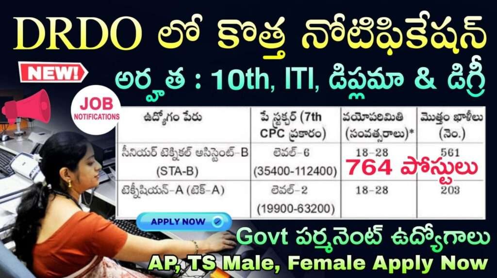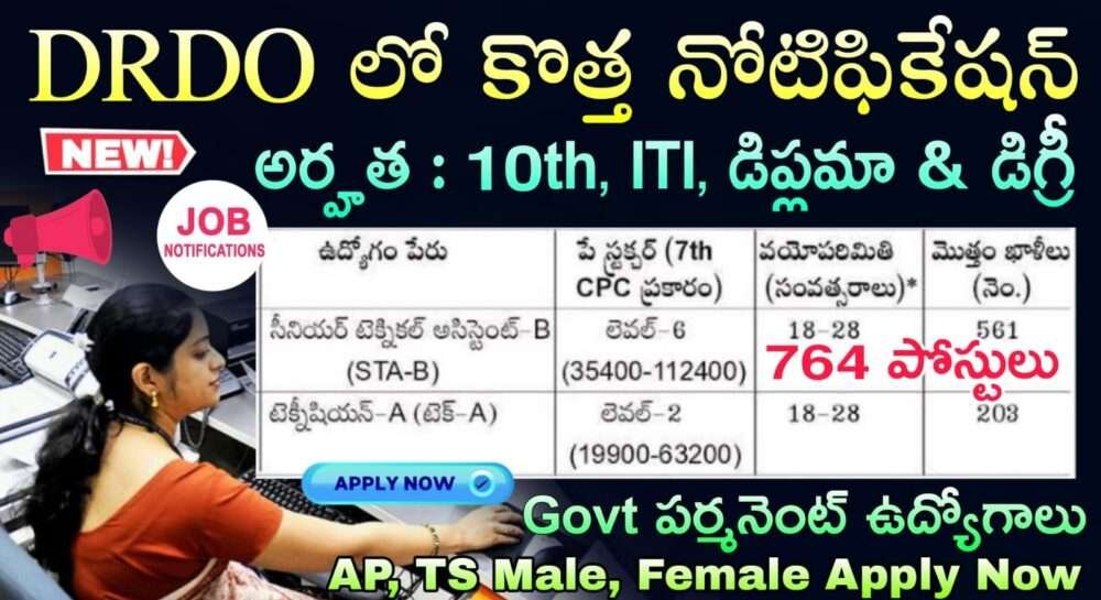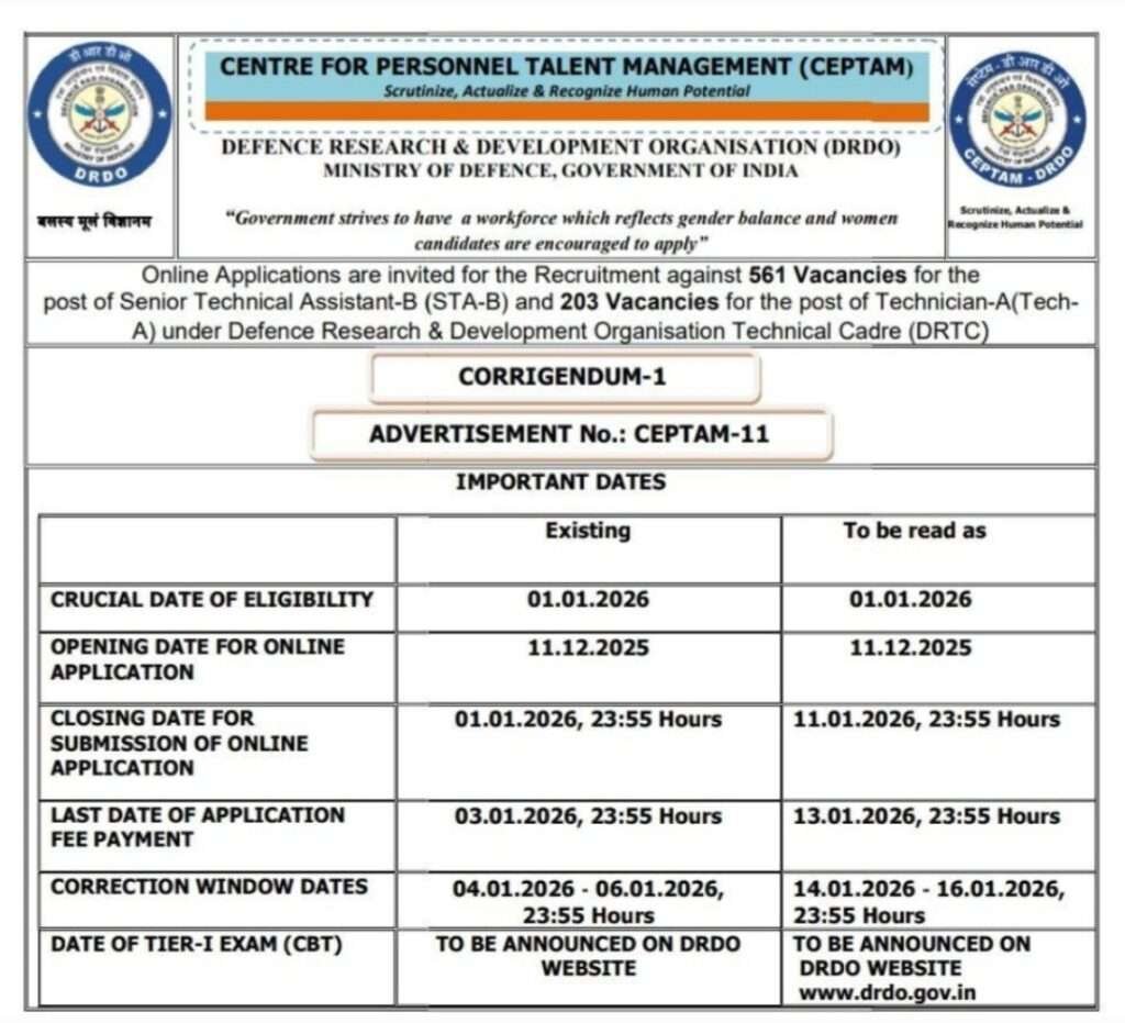DRDO CEPTAM 11 Recruitment 2025 Latest Technician& Senior Technical Assistant Job Notification 2025 Apply Now : డిఫెన్సె రీసెర్చ్ & డెవలప్మెంట్ ఆర్గనైజేషన్ (DRDO) లో పర్సనల్ టాలెంట్ మేనేజ్మెంట్ సెంటర్ (CEPTAM) ద్వారా సీనియర్ టెక్నికల్ అసిస్టెంట్-బి మరియు టెక్నీషియన్-ఎ పోస్టులకు అర్హత కలిగిన అభ్యర్థుల నుండి ఆన్లైన్ లో డిసెంబర్ 11, 2025 నుంచి ఆహ్వానిస్తుంది. 01 జనవరి నుంచి 11 జనవరి 2026 లోపు ఆన్లైన్లో అప్లై అప్లై చేసుకోవడానికి గడువు పొడిగించారు. ఈ నోటిఫికేషన్ లో మొత్తం 764 ఖాళీలైతే ఉన్నాయి. DRDO అధికారిక వెబ్సైట్ www.drdo.gov.in ద్వారా అప్లై చేసుకుంటే కేంద్ర ప్రభుత్వ ఉద్యోగం పెర్మనెంట్ సొంత రాష్ట్రంలో జాబ్ వస్తుంది.