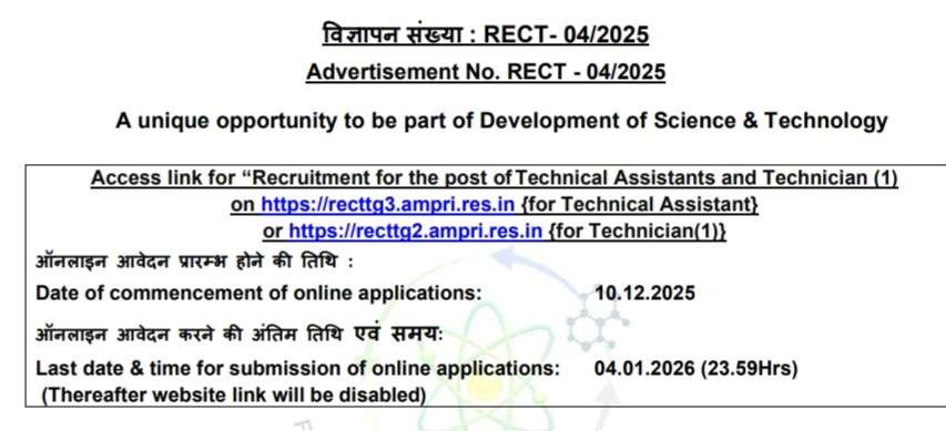 CSIR AMPRI Recruitment 2025 Latest Technical Assistant & Technician Job Notification 2025 Apply Now: నిరుద్యోగులకు మంచి అదిరిపోయే శుభవార్త ఎందుకంటే ఈరోజు మేము మీకోసం CSIR- అడ్వాన్స్డ్ మెటీరియల్స్ & ప్రాసెసెస్ రీసెర్చ్ ఇన్స్టిట్యూట్ (AMPRI) లో టెక్నికల్ అసిస్టెంట్ మరియు టెక్నీషియన్ పోస్టుల నియామకం కోసం కొత్త నోటిఫికేషన్ విడుదల. ఆన్లైన్ దరఖాస్తులను సమర్పించడానికి చివరి తేదీ 04.01.2026 (23.59 గంటలు) లోపు https://recttg3.ampri.res.in ఆన్లైన్ లో అప్లై చేసుకోవాలి.