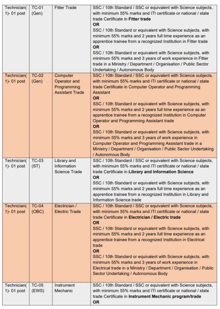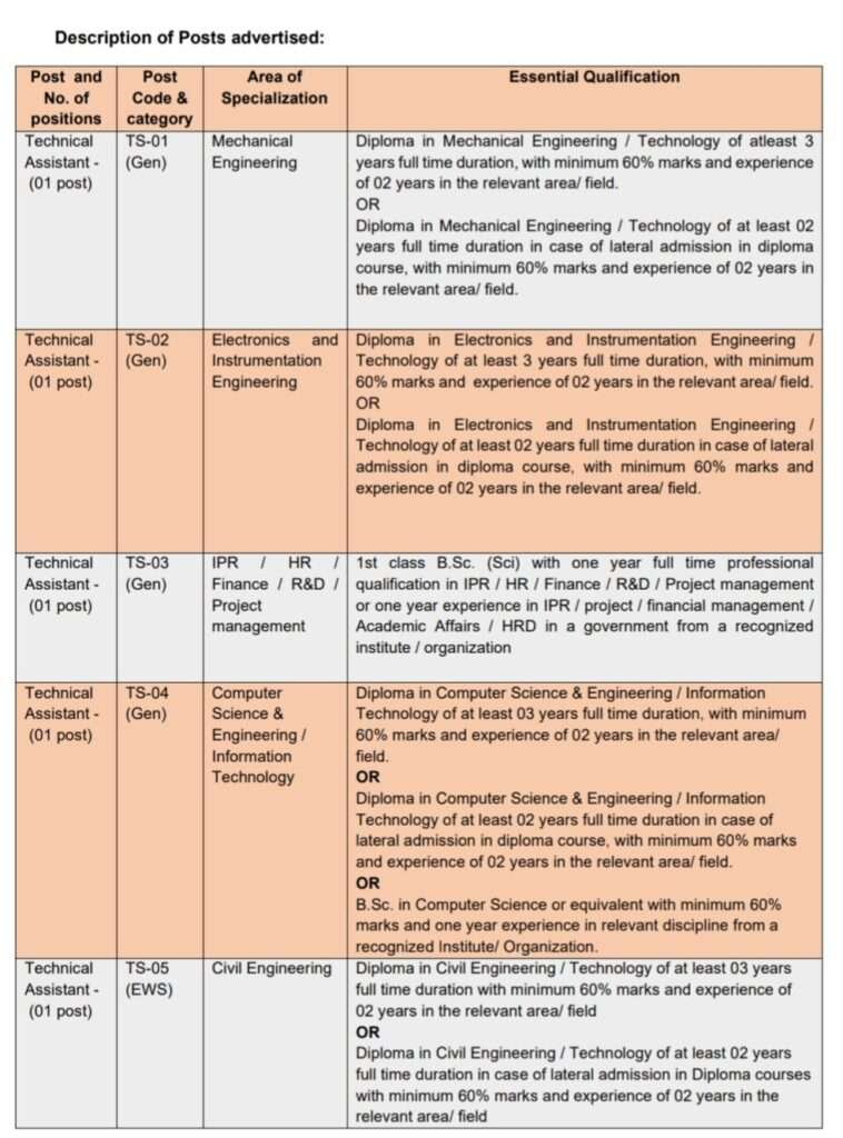 •టెక్నికల్ అసిస్టెంట్ :: కనీసం 60% మార్కులతో కనీసం 3 సంవత్సరాల పూర్తి సమయం వ్యవధి గల మెకానికల్ ఇంజనీరింగ్/టెక్నాలజీలో డిప్లొమా మరియు సంబంధిత ప్రాంతంలో/రంగంలో 02 సంవత్సరాల అనుభవం. లేదా డిప్లొమా కోర్సులో పార్శ్వ ప్రవేశం విషయంలో కనీసం 02 సంవత్సరాల పూర్తి సమయం వ్యవధి గల మెకానికల్ ఇంజనీరింగ్/టెక్నాలజీలో డిప్లొమా, కనీసం 60% మార్కులు మరియు సంబంధిత ప్రాంతం/రంగంలో 02 సంవత్సరాల అనుభవం. కంప్యూటర్ సైన్స్ & ఇంజనీరింగ్/ఇన్ఫర్మేషన్ టెక్నాలజీలో కనీసం 03 సంవత్సరాల పూర్తి సమయం డిప్లొమా, కనీసం 60% మార్కులతో మరియు సంబంధిత ప్రాంతం/క్షేత్రంలో 02 సంవత్సరాల అనుభవం. లేదా డిప్లొమా కోర్సులో పార్శ్వ ప్రవేశం విషయంలో కనీసం 02 సంవత్సరాల పూర్తి సమయం వ్యవధి గల కంప్యూటర్ సైన్స్ & ఇంజనీరింగ్/ఇన్ఫర్మేషన్ టెక్నాలజీలో డిప్లొమా, కనీసం 60% మార్కులు మరియు సంబంధిత ప్రాంతం/రంగంలో 02 సంవత్సరాల అనుభవం.