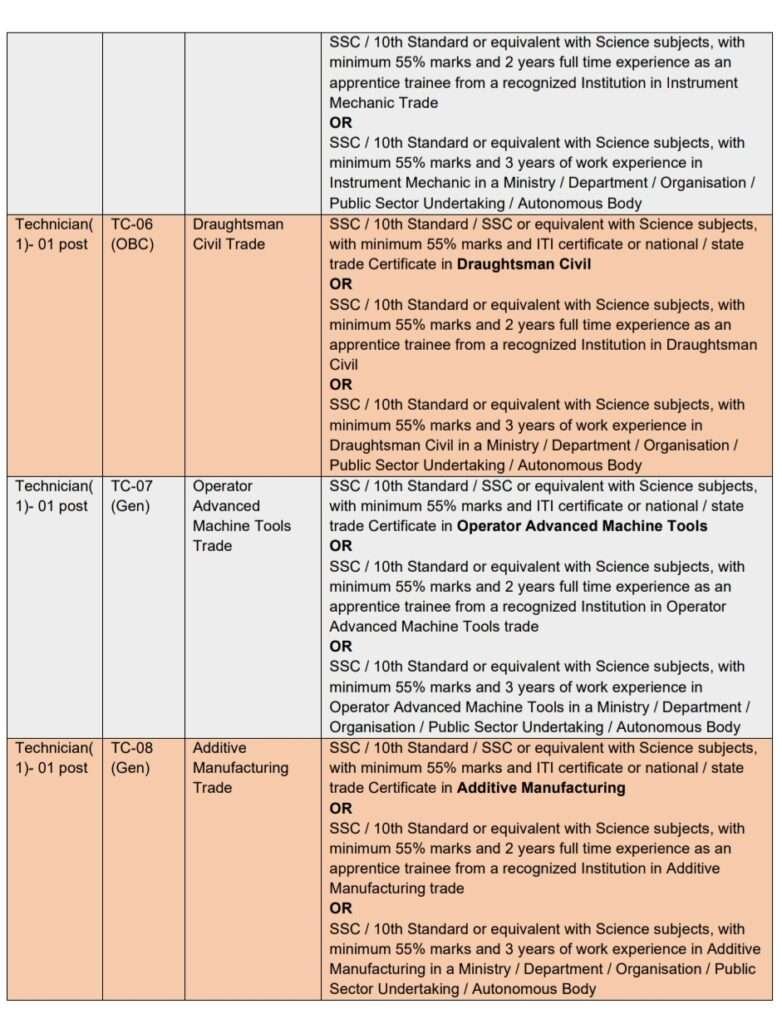 •టెక్నీషియన్ :: కనీసం 55% మార్కులతో సైన్స్ సబ్జెక్టులతో SSC/10వ తరగతి / SSC లేదా తత్సమాన పరీక్ష మరియు ఆపరేటర్ అడ్వాన్స్డ్ మెషిన్ టూల్స్లో ITI సర్టిఫికేట్ లేదా జాతీయ/రాష్ట్ర ట్రేడ్ సర్టిఫికేట్ లేదా కనీసం 55% మార్కులతో సైన్స్ సబ్జెక్టులతో SSC/10వ తరగతి లేదా తత్సమాన పరీక్ష ఉత్తీర్ణత మరియు గుర్తింపు పొందిన సంస్థ నుండి ఆపరేటర్ అడ్వాన్స్డ్ మెషిన్ టూల్స్ ట్రేడ్లో అప్రెంటిస్ ట్రైనీగా 2 సంవత్సరాల పూర్తి సమయం అనుభవం ఉండాలి.