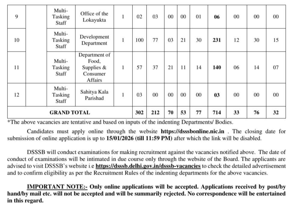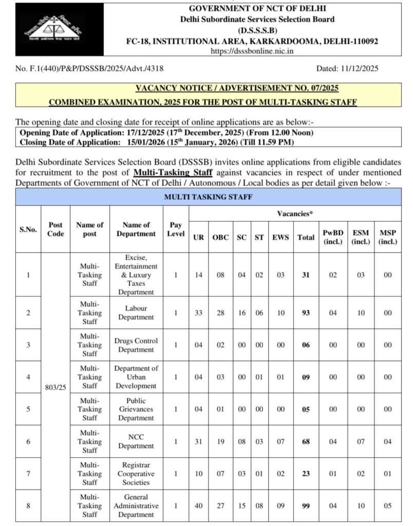 ఢిల్లీ సబార్డినేట్ సర్వీసెస్ సెలక్షన్ బోర్డ్ (DSSSB) ఢిల్లీ NCT ప్రభుత్వ విభాగాలు/స్వయంప్రతిపత్తి/స్థానిక సంస్థలకు సంబంధించి ఖాళీగా ఉన్న మల్టీ-టాస్కింగ్ స్టాఫ్ పోస్టులకు అర్హత కలిగిన అభ్యర్థుల నుండి ఆన్‌లైన్ దరఖాస్తులను ఆహ్వానిస్తుంది. కేవలం పదో తరగతి పాస్ అయి ఉంటే చాలు 18 సంవత్సరాలు 27 సంవత్సరాల మధ్యలో వయసు కలిగి ఉండాలి. ఈ నోటిఫికేషన్లు సెలెక్ట్ అయితే రూ.18,000-56,900/- మధ్యలో నెల జీతం ఇస్తారు. అర్హత గల అభ్యర్థులు https://dsssbonline.nic.in వెబ్‌సైట్ ద్వారా డిసెంబర్ 17, 2025 (మధ్యాహ్నం 12.00) నుండి జనవరి 15, 2026 (రాత్రి 11:59 వరకు) ఆన్‌లైన్‌లో దరఖాస్తు చేసుకోవచ్చు, ఆ తర్వాత లింక్ నిలిపివేయబడుతుంది.అభ్యర్థులు తమ దరఖాస్తును ఆన్‌లైన్ మోడ్ ద్వారా మాత్రమే సమర్పించాలి.