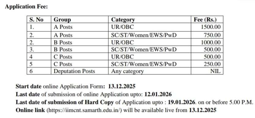 »ఎలా దరఖాస్తు చేయాలి : ఆన్లైన్ దరఖాస్తులు మాత్రమే అంగీకరించబడతాయి. ఆన్లైన్ దరఖాస్తు ఫారమ్ యొక్క హార్డ్ కాపీ, అన్ని స్వీయ-ధృవీకరించబడిన టెస్టిమోనియల్లు, సర్టిఫికెట్లు/విద్యా అర్హతలు మరియు అన్ని సహాయక పత్రాలతో పాటు పైన పేర్కొన్న వివరాలతో కూడిన డిమాండ్ డ్రాఫ్ట్ను న్యూఢిల్లీలో చెల్లించాల్సిన ఇండియన్ ఇన్స్టిట్యూట్ ఆఫ్ మాస్ కమ్యూనికేషన్ పేరుతో డ్రా చేసి, “ది డిప్యూటీ రిజిస్ట్రార్, ఇండియన్ ఇన్స్టిట్యూట్ ఆఫ్ మాస్ కమ్యూనికేషన్, అరుణ అసఫ్ అలీ మార్గ్, న్యూ JNU క్యాంపస్, న్యూఢిల్లీ 110067” కు ఆన్లైన్ దరఖాస్తు ఫారమ్ సమర్పించిన చివరి తేదీ నుండి ఒక వారం లోపల క్లోజ్డ్ ఎన్వలప్లో 19.01.2026 నాటికి స్పీడ్ పోస్ట్/రిజిస్టర్డ్ పోస్ట్ ద్వారా మాత్రమే పంపాలి, లేకుంటే దరఖాస్తు తిరస్కరించబడుతుంది. మరే ఇతర చెల్లింపు విధానం అంగీకరించబడదు లేదా తిరిగి చెల్లించబడదు.