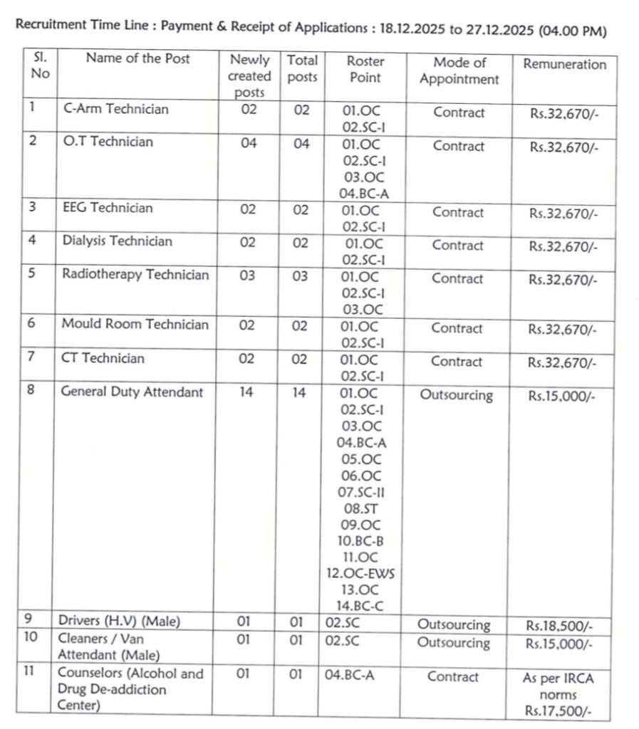 పోస్ట్ పేరు :: సి-ఆర్మ్ టెక్నీషియన్, O.T టెక్నీషియన్, EEG టెక్నీషియన్, డయాలసిస్ టెక్నీషియన్, రేడియోథెరపీ టెక్నీషియన్, మోల్డ్ రూమ్ టెక్నీషియన్, CT టెక్నీషియన్, జనరల్ డ్యూటీ అటెండెంట్, డ్రైవర్లు & క్లీనర్లు/వ్యాన్ అటెండెంట్ పోస్టులు ఉన్నాయి.