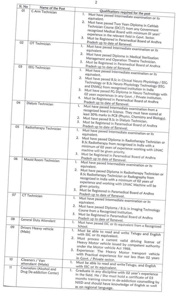 •O.T టెక్నీషియన్ :: ఇంటర్మీడియట్ పరీక్ష లేదా దానికి సమానమైన పరీక్షలో ఉత్తీర్ణులై ఉండాలి. మెడికల్ స్టెరిలైజేషన్ మేనేజ్మెంట్ మరియు ఆపరేషన్ థియేటర్ టెక్నీషియన్లో డిప్లొమా ఉత్తీర్ణులై ఉండాలి. పునరుద్ధరణ తేదీ వరకు ఆంధ్రప్రదేశ్ పారామెడికల్ బోర్డ్లో రిజిస్టర్ అయి ఉండాలి.