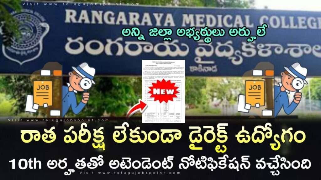 RMC Recruitment 2025 Latest Technician & Attendant Job Notification 2025 Apply Now: 10th రాత పరీక్ష లేకుండా.. రంగరాయ మెడికల్ కాలేజ్, DME నియంత్రణలో కాంట్రాక్ట్/ఔట్సోర్సింగ్ ప్రాతిపదికన సి-ఆర్మ్ టెక్నీషియన్, O.T టెక్నీషియన్, EEG టెక్నీషియన్, డయాలసిస్ టెక్నీషియన్, రేడియోథెరపీ టెక్నీషియన్, మోల్డ్ రూమ్ టెక్నీషియన్, CT టెక్నీషియన్, జనరల్ డ్యూటీ అటెండెంట్, డ్రైవర్లు & క్లీనర్లు/వ్యాన్ అటెండెంట్ పోస్టుల భర్తీకి అర్హులైన అభ్యర్థుల నుండి దరఖాస్తులు ఆహ్వానించబడ్డాయి. కాకినాడలోని రంగరాయ మెడికల్ కాలేజీలో మొదటగా ఒక సంవత్సరం పాటు పనిచేయడానికి జిల్లా ఎంపిక కమిటీ ద్వారా ఎంపిక విధానం దరఖాస్తుల చెల్లింపు & రసీదు: 18.12.2025 నుండి 27.12.2025 (సాయంత్రం 04.00) లోపు ఆఫ్ లైన్ లో అప్లై చేయాలి.