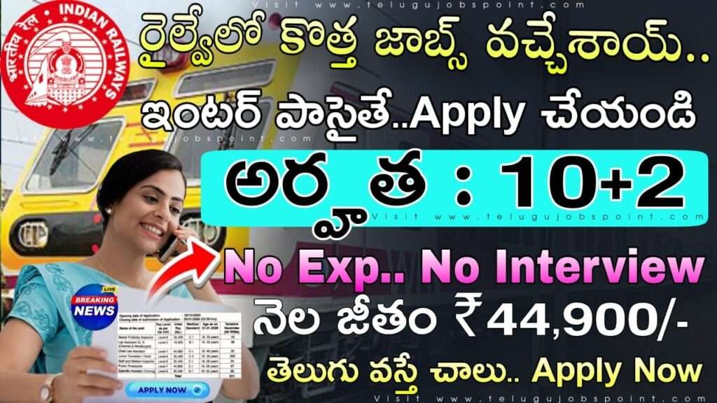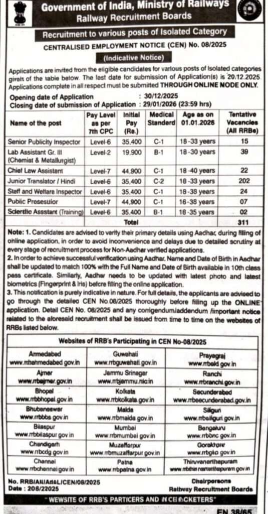 RRB NTPC Isolated Category Recruitment 2025 Latest Lab Assistant Gr III & Assstant Job Notification 2025 Apply Now : రైల్వే మంత్రిత్వ శాఖలో రైల్వే రిక్రూట్మెంట్ బోర్డు(RRB) ఐసోలేటెడ్ కేటగిరీలోని సీనియర్ పబ్లిసిటీ ఇన్స్పెక్టర్, ల్యాబ్ అసిస్టెంట్ గ్రేడ్ III, చియెట్ లా అసిస్టెంట్, జూనియర్ ట్రాన్సలేటర్/హిందీ, స్టాఫ్ అండ్ వెల్ఫేర్ ఇన్స్పెక్టర్, పబ్లిక్ ప్రెసిజర్ & సైంటిఫిక్ అసిస్టెంట్ వివిధ పోస్టులకు నియామకం కోసం షార్ట్ నోటిఫికేషన్ విడుదల చేశారు. ఈ నోటిఫికేషన్ లో టెన్త్ ప్లస్ టు ఎన్ని డిగ్రీ మాస్టర్ డిగ్రీ కంప్లీట్ చేసిన అభ్యర్థులు అప్లై చేసుకోవచ్చు. వయసు 18 సంవత్సరాల నుంచి 40 సంవత్సరాలు మధ్యలో కలిగి ఉండాలి. సొంత జిల్లాలోని రాత పరీక్ష మరియు పోస్టింగ్ ఉంటుంది అప్లికేషన్ చేసుకున్నట్లయితే. RRB దరఖాస్తు సమర్పణకు చివరి తేదీ 29/01/2026 (రాత్రి 5:59 గంటలు) లోపు దరఖాస్తులను https://indianrailways.gov.in/ ఆన్లైన్ నోడ్ ద్వారా మాత్రమే సమర్పించాలి.