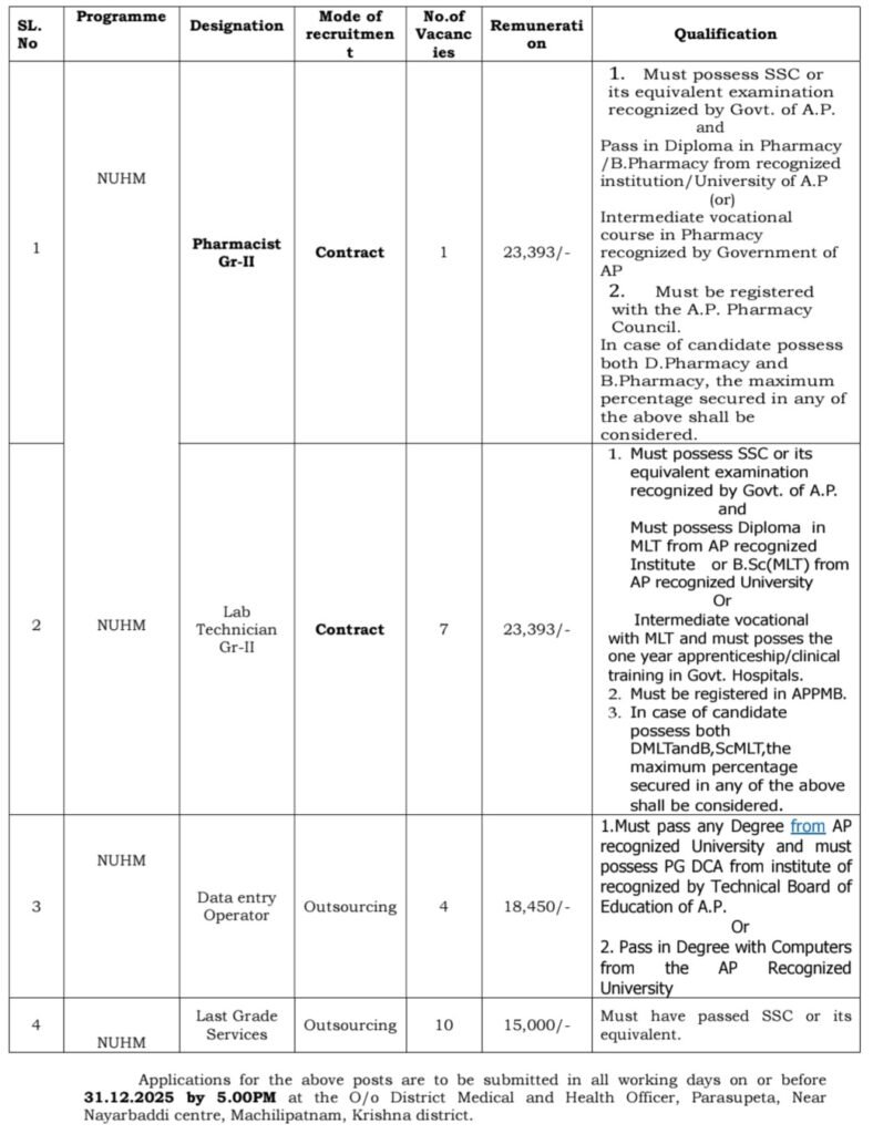 »ఎలా దరఖాస్తు చేయాలి : పైన పేర్కొన్న పోస్టుల కోసం దరఖాస్తులను అన్ని పని దినాలలో 31.12.2025న లేదా అంతకు ముందు సాయంత్రం 5.00 గంటలలోపు జిల్లా వైద్య మరియు ఆరోగ్య అధికారి, పరసుపేట, నాయర్బడ్డి కేంద్రం దగ్గర, మచిలీపట్నం, కృష్ణా జిల్లాకు సమర్పించాలి.