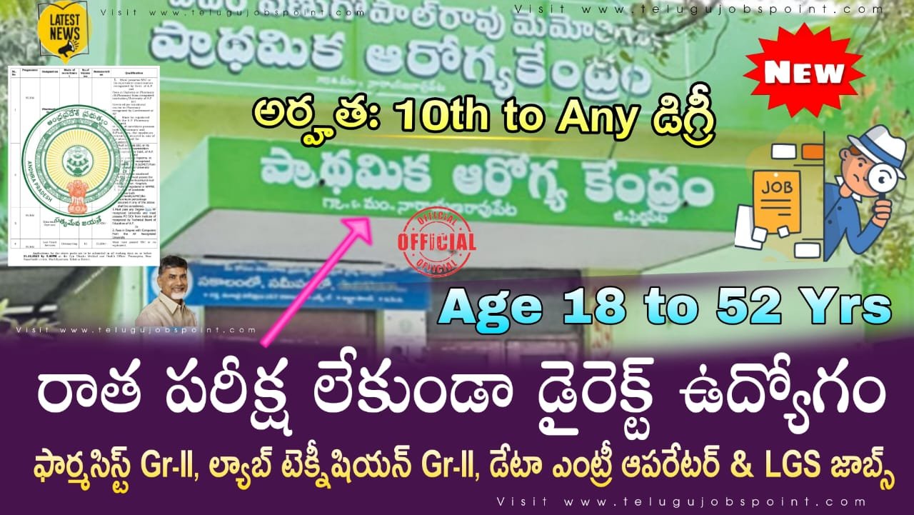 AP NHM UPHC Recruitment 2025 Latest Lab Technician, Data entry Operator & LGS Job Notification 2025 Apply Now : కేవలం పదో తరగతి పాసైన అభ్యర్థుల నుంచి ఎటువంటి రాత పరీక్ష లేకుండా జిల్లాలో డైరెక్ట్ ఉద్యోగం పొందే అవకాశం రావడం జరిగింది. ఆంధ్రప్రదేశ్ ప్రభుత్వ ఆరోగ్య మరియు కుటుంబ సంక్షేమ శాఖ, జిల్లా లో అర్బన్ PHCలలో ఫార్మసిస్ట్ Gr-II, ల్యాబ్ టెక్నీషియన్ Gr-II, డేటా ఎంట్రీ ఆపరేటర్ & లాస్ట్ గ్రేడ్ సర్వీసెస్ ఖాళీగా ఉన్న పోస్టులను కాంట్రాక్ట్/ఔట్ సోర్సింగ్ ప్రాతిపదికన భర్తీ భర్తీకి నోటిఫికేషన్ విడుదల చేశారు. వయస్సు 18 సంవత్సరాలు నుంచి 42 సంవత్సరాల మధ్యలో ఉండాలి. అర్హత 10th, B.Sc(MLT), Any డిగ్రీ & Diploma in Pharmacy /B.Pharmacy అర్హతతో రాత పరీక్ష లేకుండా డైరెక్ట్ ఉద్యోగం. దరఖాస్తు ప్రొఫార్మా 22.12.2025 నుండి 31.12.2025 వరకు సాయంత్రం 05:00 గంటల వరకు ఆఫ్ లైన్ లో వెంటనే అప్లై చేసుకోండి.